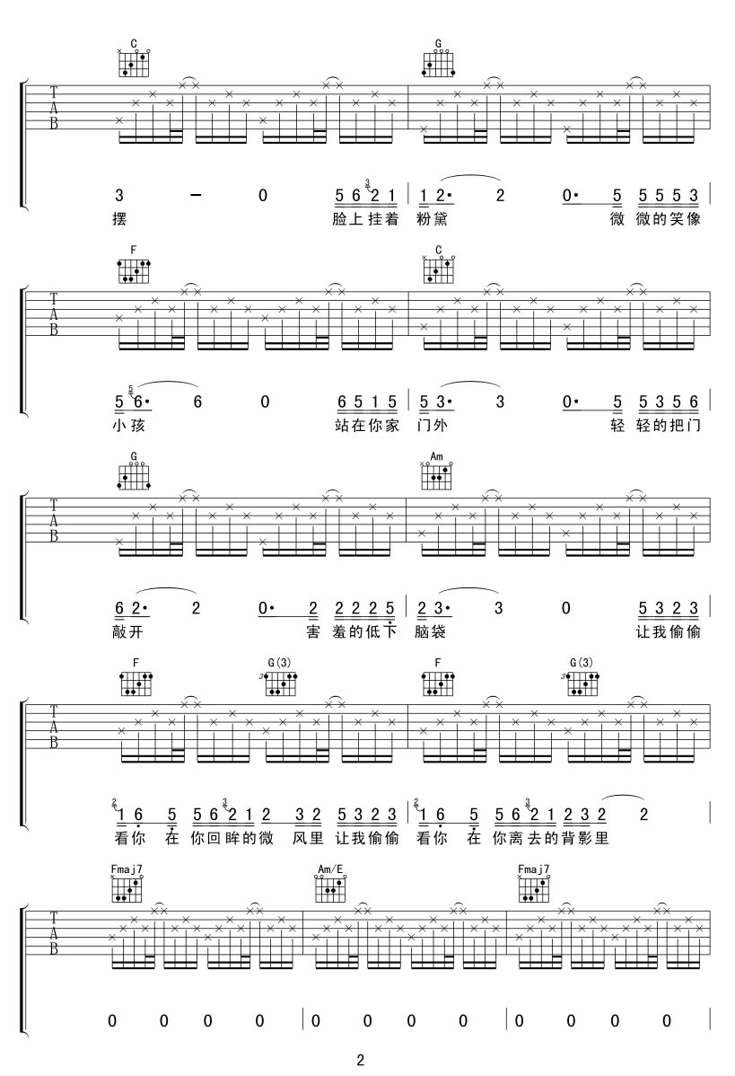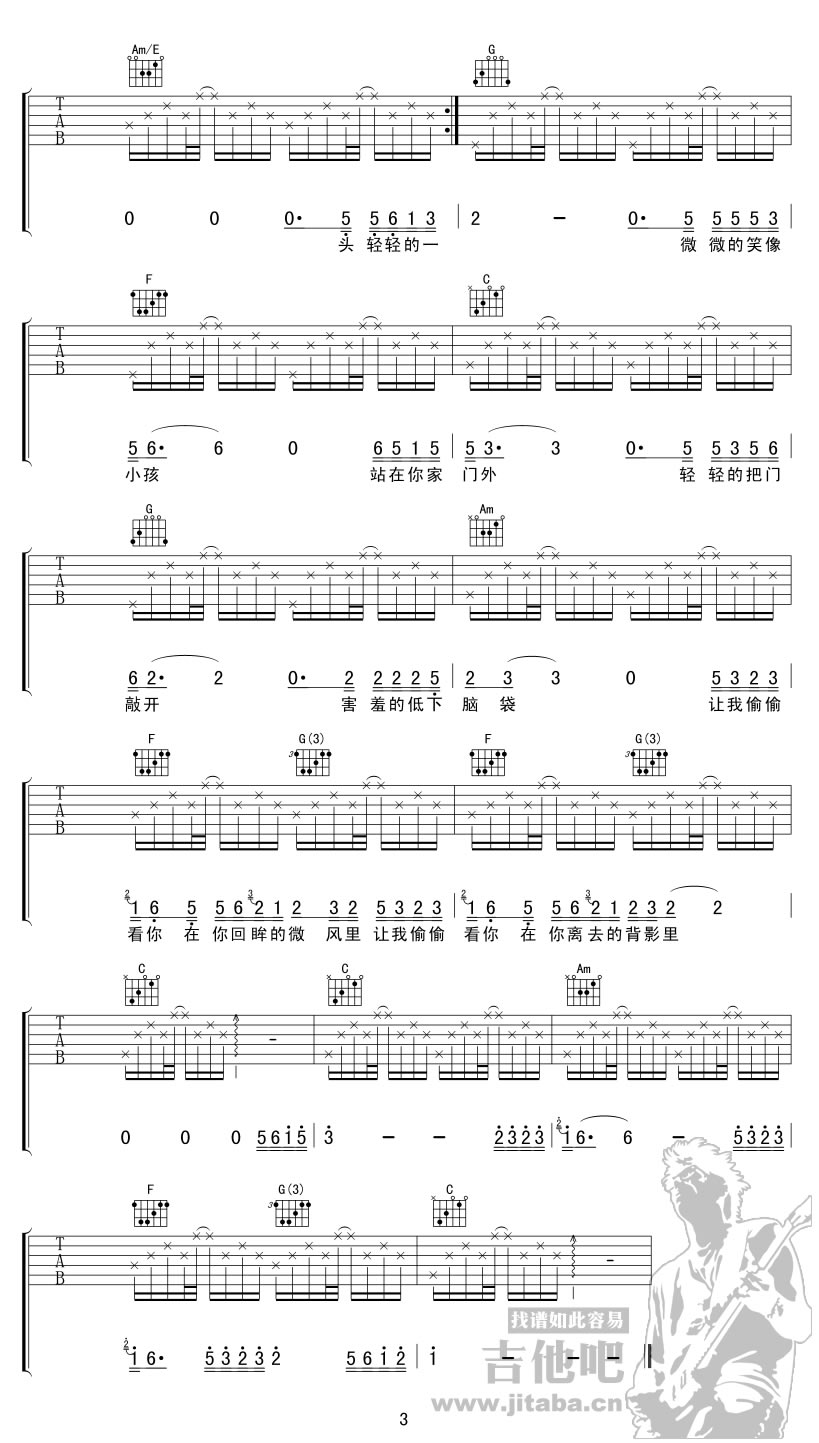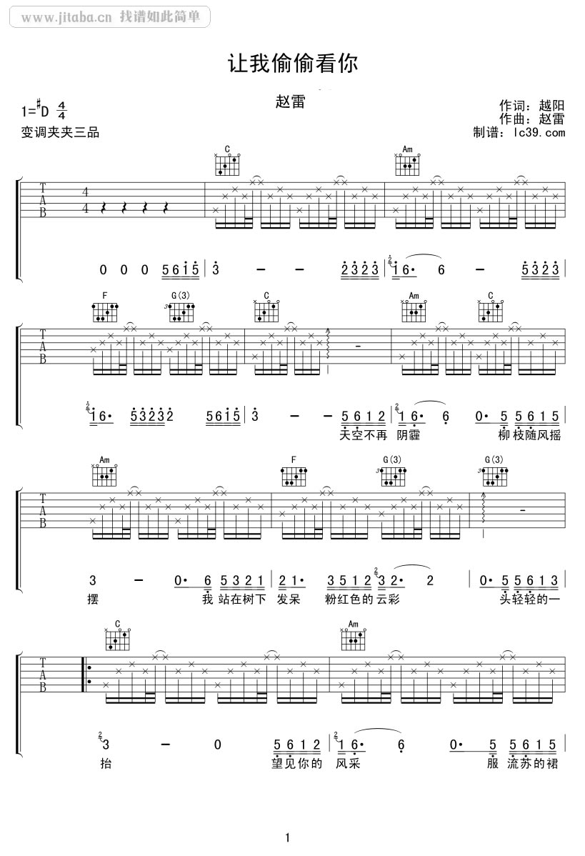曲谱介绍: 赵雷的《让我偷偷看你》吉他谱,曲谱为六线谱编配,歌曲原调#D,采用变调夹夹三品,让我偷偷看你吉他弹唱谱,完整版共三张图片谱例,《阿弥陀佛么么哒一个孩子的心愿》专辑中的一个故事主人公越阳写的吉他弹唱歌曲,赵雷的谱曲演绎,民谣确实有温柔人心的魅力,感谢lc39制谱分享。