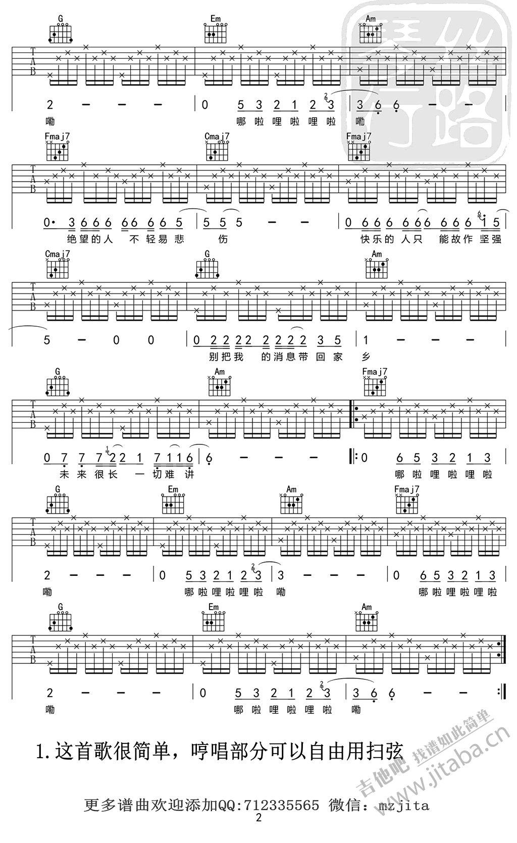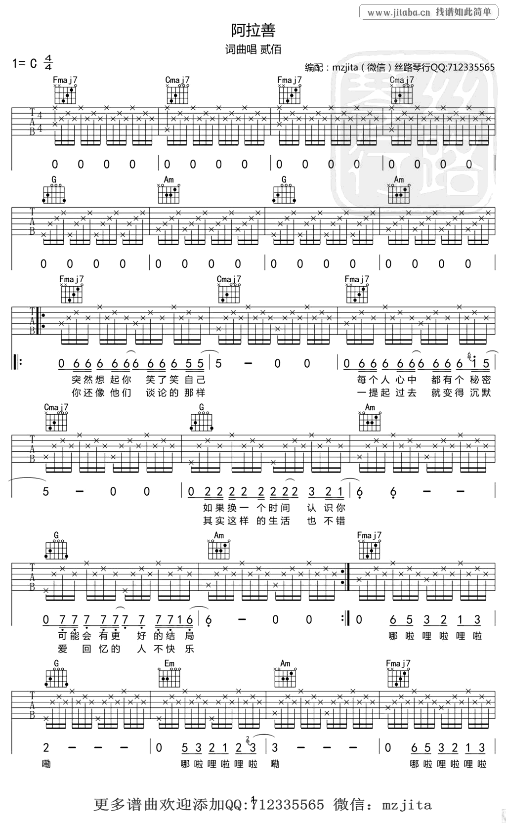 曲谱介绍: 贰佰阿拉善吉他谱,C调指法编配,阿拉善吉他弹唱谱,六线谱高清图片谱。这首歌曲很简单,哼唱部分自由扫弦就可以了,感谢mzjita编配。