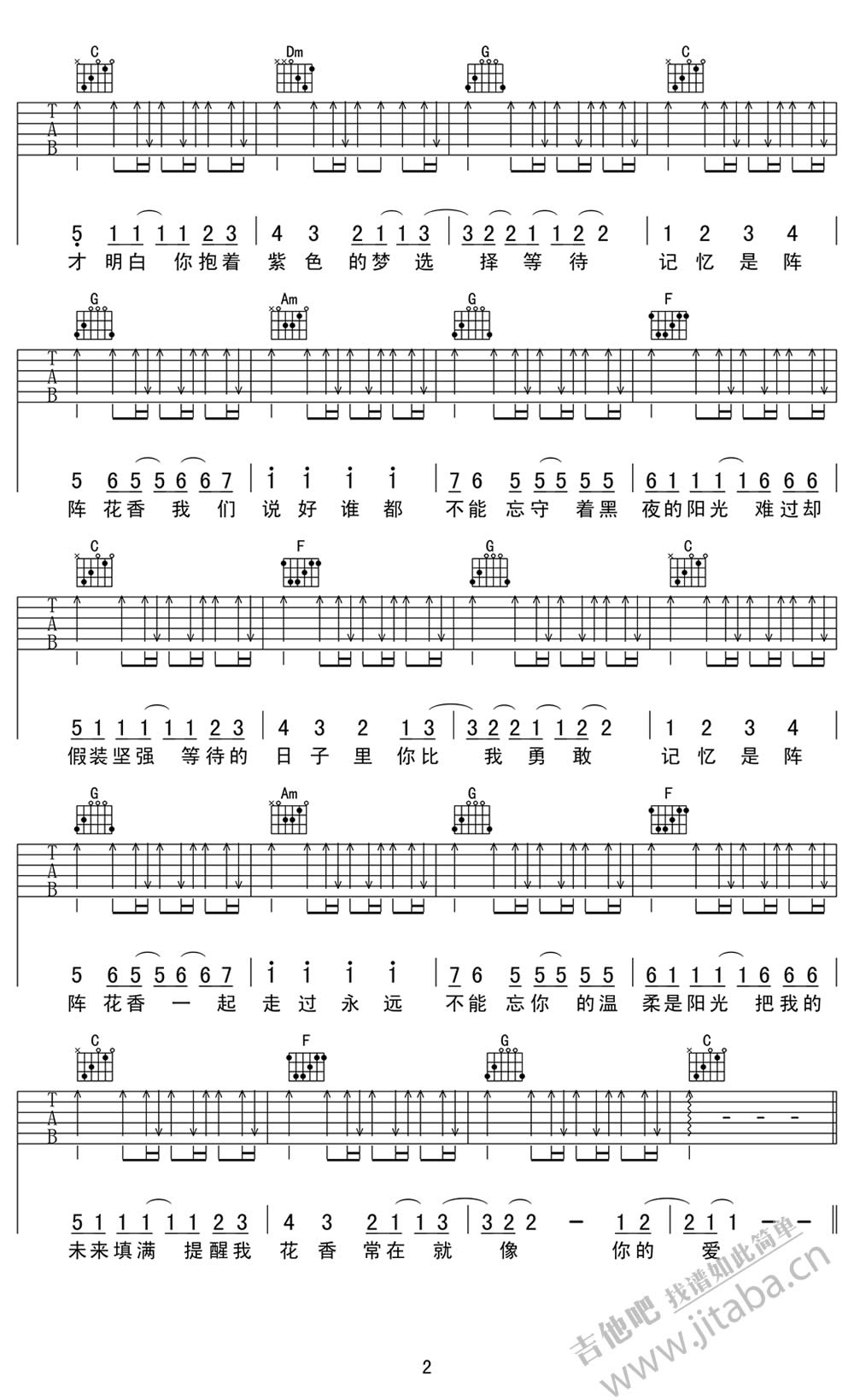 曲谱介绍: 许绍洋花香吉他谱,C调指法,图片谱高清版,靠谱吉他出品。偶像剧《薰衣草》主题曲,花香吉他六线谱,熟悉的旋律总是能打动心扉,勾起最深处动人的紫色记忆,酸酸的又有饱满的幸福感。许绍洋的花香,那些年难以忘怀的记忆。当旧物唤醒心底的记忆,一种依恋缠绕心头。