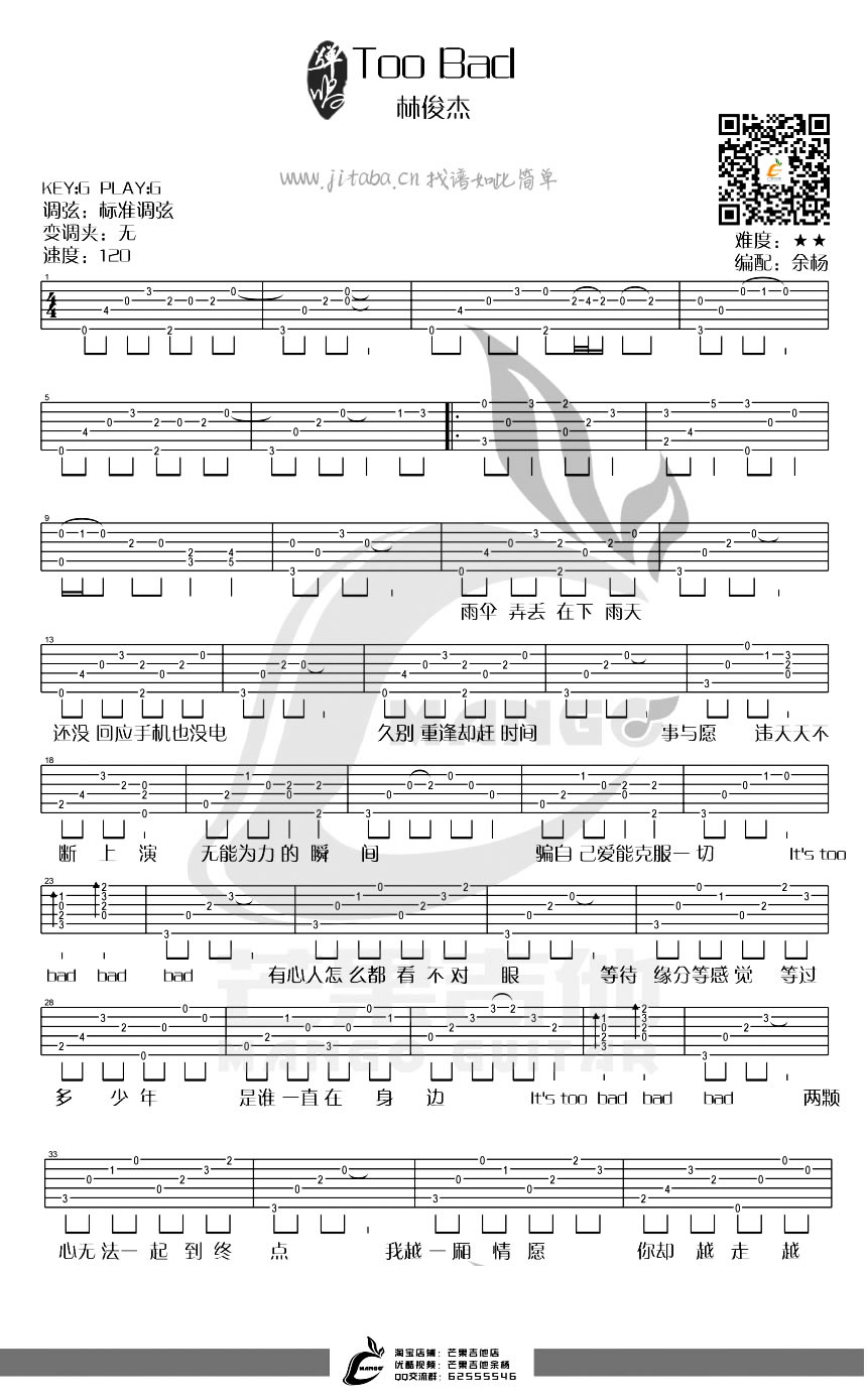 曲谱介绍: 林俊杰Too Bad吉他谱,G调指法标准调弦,Too Bad吉他六线谱,难度两颗星,吉他谱由芒果吉他余杨老师编配。《Too Bad》是林俊杰专辑《和自己对话》的一首悲伤的情歌,盲目相信爱能战胜一切,唱出了多少人的心痛和遗憾。随谱附上Too Bad吉他弹唱示范视频,方便琴友们参考学习。