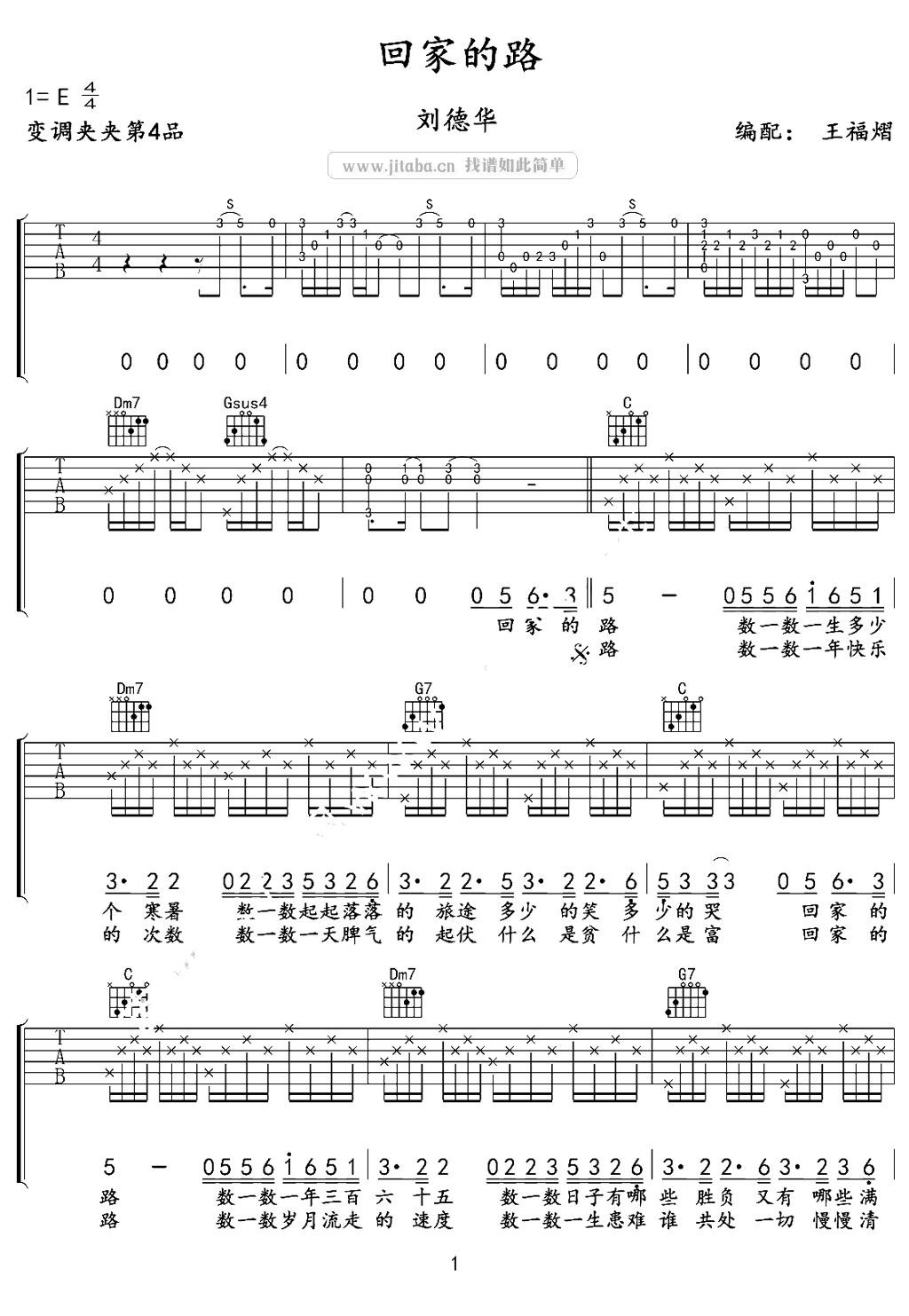 曲谱介绍: 刘德华回家的路吉他谱,六线谱图片高清版,E调变调夹夹第四品,感谢王福熠编配,回家的路吉他弹唱谱,总提编排简单容易上手,除了前奏稍有难度,但是大多也是均匀的16分音符。弹奏的时候,琴友们需要注意吉他谱中反复的部分,主歌部分需要要多唱几遍。这首歌是刘德华主演电影《失孤》的主题曲,温暖动听的歌声,朴实感人的歌词,唱出了每个出外的游子思乡返家的心情,回家的路也成为岁末春运的主题曲。