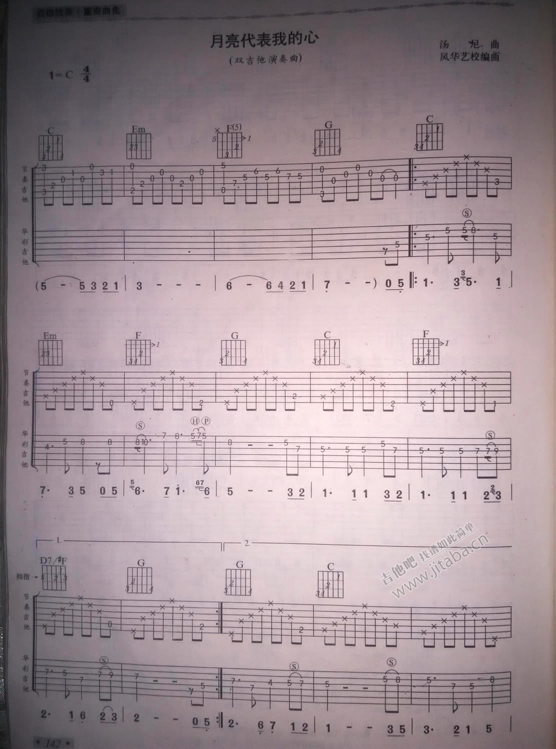 曲谱介绍: 邓丽君月亮代表我的心吉他谱,节奏吉他和华彩吉他,双吉他版本编配,C调指法。感谢风华艺校编曲。无需多言的经典,情太重意过深,温柔的旋律是未曾轻琴谱网出的等待和期盼。无论世界如何改变,心中对于爱的信念不变,无论岁月如何更迭,彼此那份依恋仍然留存心间;吉他六弦的琴音是我对你深深的思念,当永恒的旋律萦绕耳畔,我会为你弹奏一遍一遍,只因月亮代表我的心,只为星辰洒落我的面。