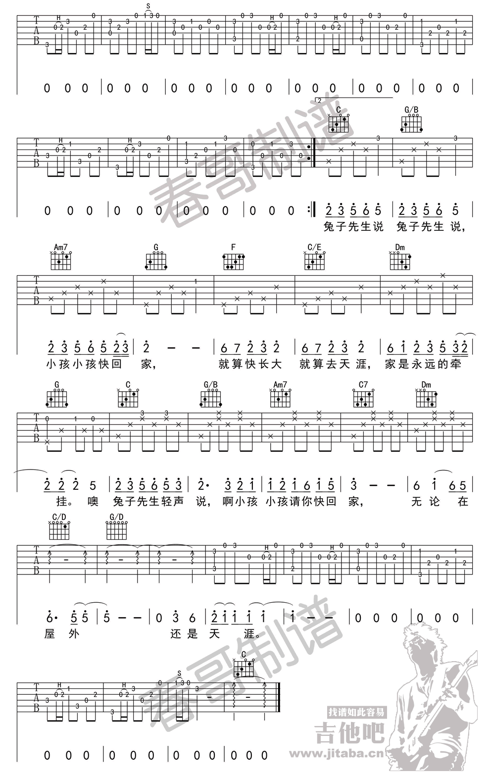 曲谱介绍: 兔子先生吉他谱,C调指法六线谱编配,变调夹夹二品就女生版,夹六品就男生版。洛天依单曲演唱的温暖民谣风歌曲,一首以想家为题材旋律温馨的歌,希望能在这个岁末的冬天给大家带来一丝暖暖的心意。兔子先生吉他弹唱谱,共三张图片谱例,感谢春哥制谱分享。