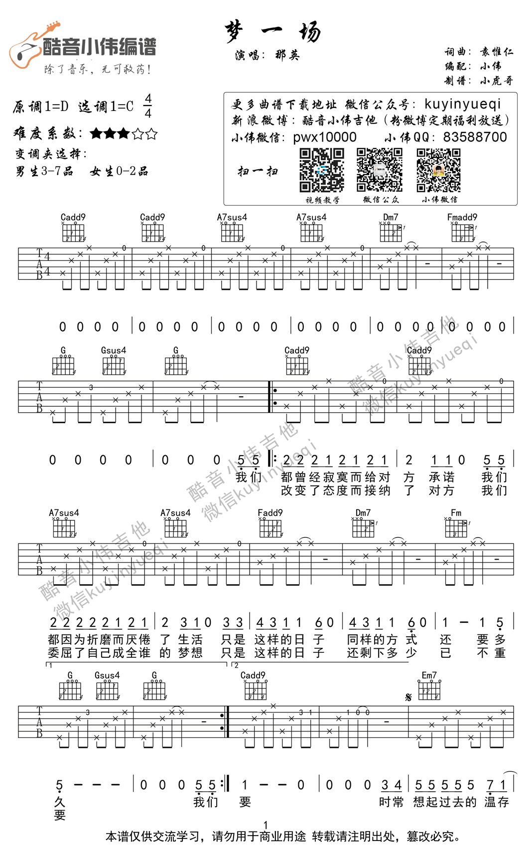 曲谱介绍: 梦一场吉他谱,C调完美版,那英的一首经典老歌,梦一场吉他弹唱谱,六线谱两张图片。原调D选调C调,难度系数三颗星,变调夹选择男生3-7品,女生0-2品。感谢小伟编配小虎哥制谱,酷音乐器分享。幽幽的曲风,唱出淡淡的哀愁,没有太大的情绪起伏,像是诉说着一个平凡的爱情故事,却戚戚地揪痛了许多人的心,牵绊着听者的心绪。指尖拨动琴弦,旋律缓缓响起,心开始安静,或许只是一场无疾而终的梦,只想在没有你的地方独自疗伤。