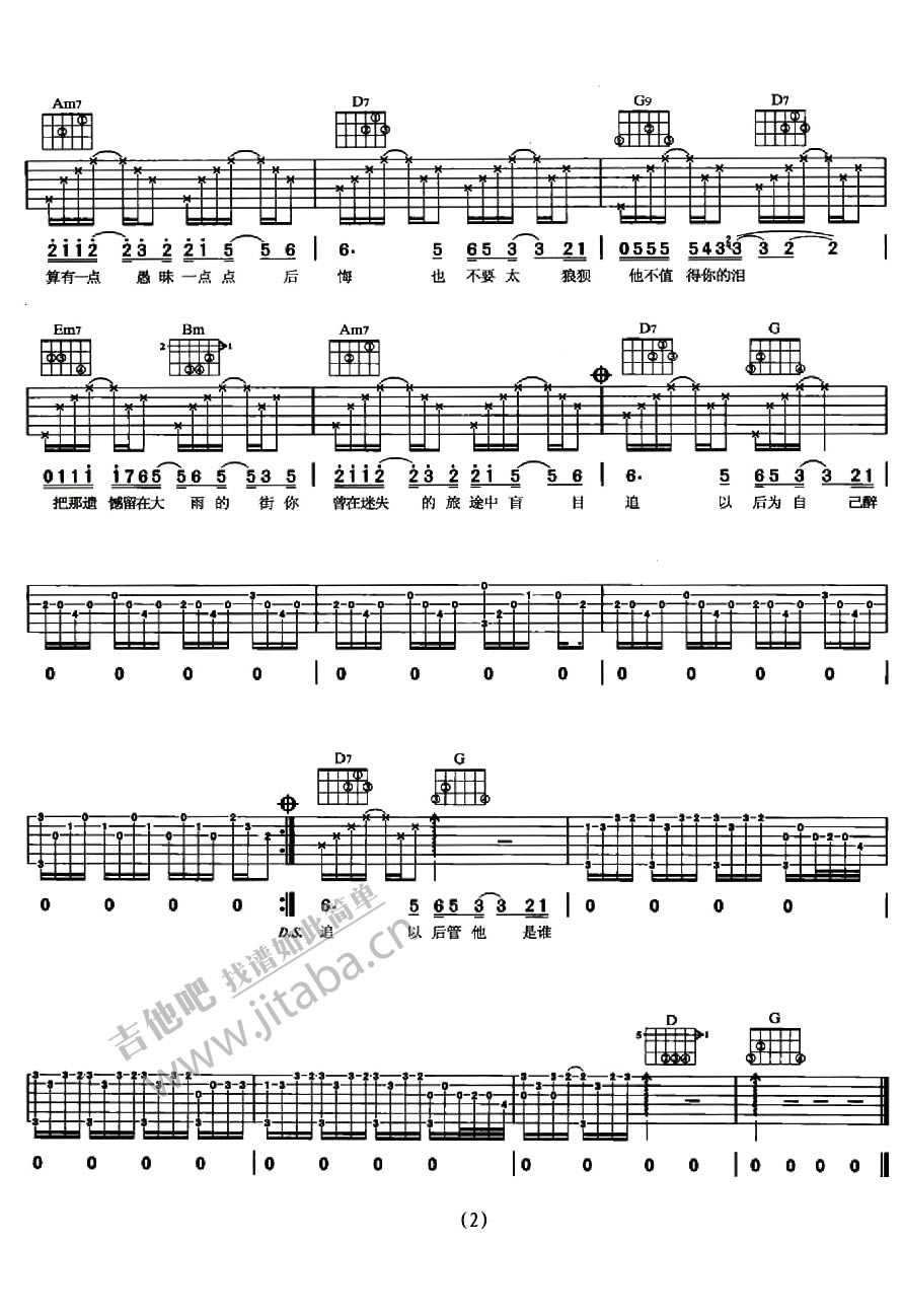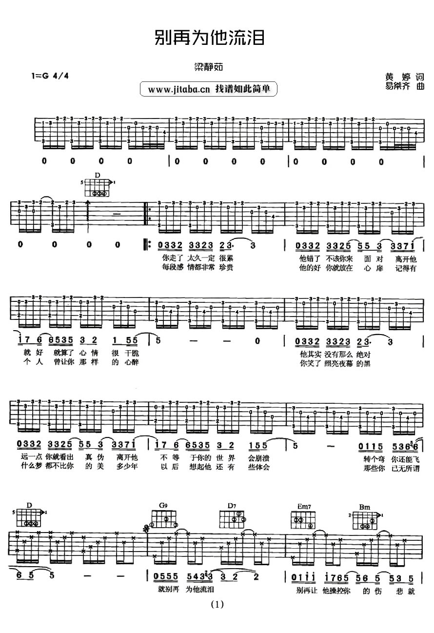 曲谱介绍: 梁静茹别再为他流泪吉他谱,六线谱编配图片谱格式,梁静茹的一首失恋情歌《别再为他流泪》吉他弹唱谱。有时候,能说服自己的却是一个远远的陌生人,字字句句进到心坎里,也许,唱的总比说得好听,希望自己能够走出去。静茹的歌总能唱出我们感受深刻却无法言说的情绪,给人一种来自于本心的动力,继续追寻未来的自己。