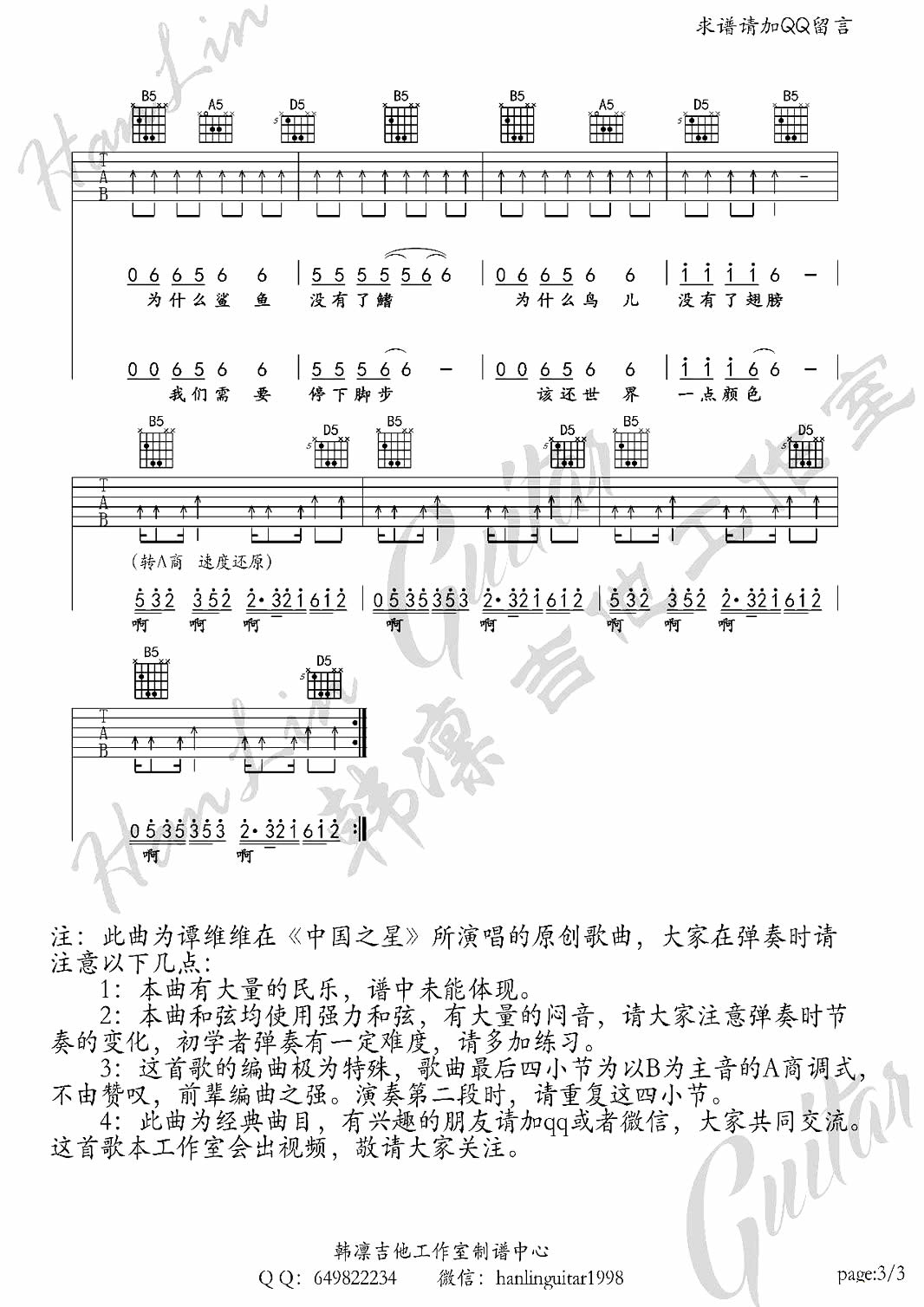 曲谱介绍: 谭维维给你一点颜色吉他谱,D转A调,这首歌曲是谭维维在《中国之星》节目演唱的一首原创歌曲,给你一点颜色吉他六线谱,本曲谱为改编版本,原版里面大量的民乐未在谱里体现,和弦方面使用了强力和弦,有大量的闷音,弹奏时候注意节奏的变化。初学者需要多练习。