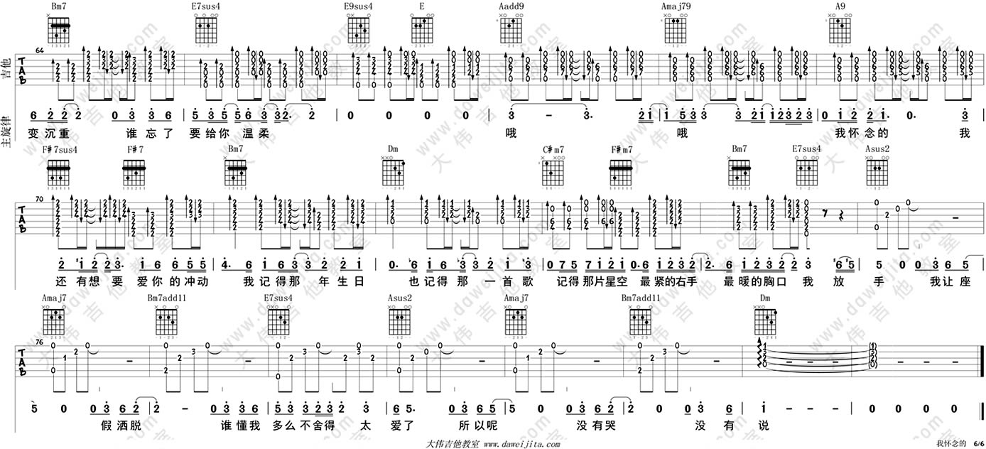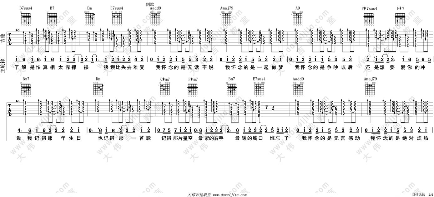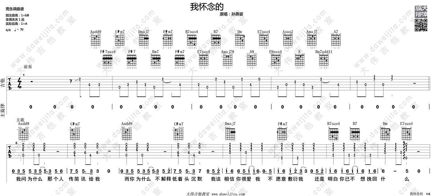 曲谱介绍: 孙燕姿我怀念的吉他谱,男生版曲谱,原调指法音高bB,变调夹夹一品,实际音高A调。萧敬腾《我怀念的》吉他弹唱谱,共六张图片谱。这首歌曲使用的和弦较多,扫弦节奏琴友们参考弹唱教学视频练习掌握。一首老歌,唱出了多少人的心碎回忆。人生就是这样的充满遗憾与怀念,因为不忘初心,所以我们怀念。想要方得始终,我们必须要怀念。这首《我怀念的》送给大家。