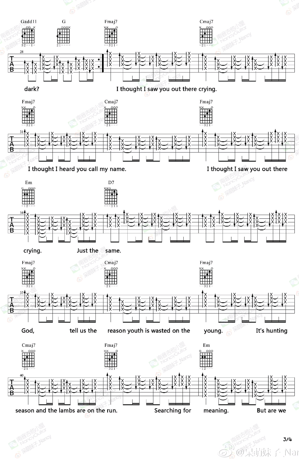 曲谱介绍: Lost Stars吉他谱,Adam Levine演唱,电影《Begin again》插曲,Lost Stars吉他六线谱,图片谱共四张,感谢呆萌妹子Nancy编配,这首歌曲的扫弦节奏比较有特点,觉得难的话可以去看我的教学视频,有详细的讲解。记得要慢速练习。原唱的嗓音很高,女生唱刚好,男生如果觉得唱不上去,可以降半音,或者直接把变调夹夹在四五品的位置,降八度去唱。一部平淡如水的电影,音乐是最动人的地方,推荐琴友们《Begin again》也就是《歌曲改变人生/再次出发之纽约遇见你》。随谱放上Nancy的Lost Stars吉他弹唱随谱示范。