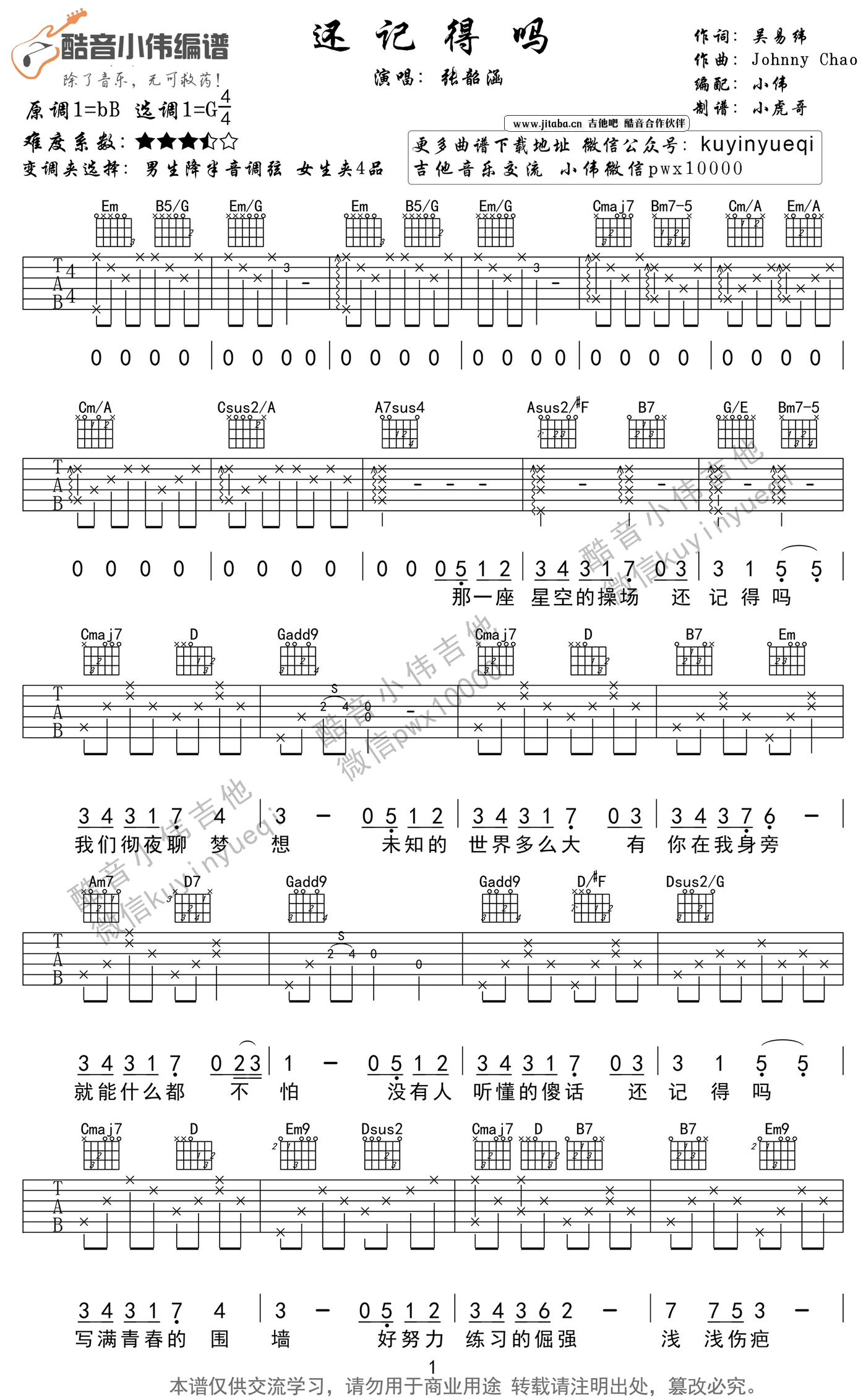 曲谱介绍: 张韶涵还记得吗吉他谱,原调bB,选调G,变调夹选择,男生降半音调弦,女生夹四品。还记得吗吉他六线谱,高清图片谱,感谢酷音小伟编配,随谱送上小伟老师和王子月为琴友们录制的《还记得吗》吉他弹唱教学示范。曾经在纸上涂涂写写许多遍的歌词,曾经时常在耳边盘旋飘扬的旋律,原本以为隔了那么久,它们也像那时候的歌词本和mp3一样,失去了线索,但当你开口的时候,才发现我和从前一样可以一句不落的合唱,以为忘记了的,原来都还记得。
