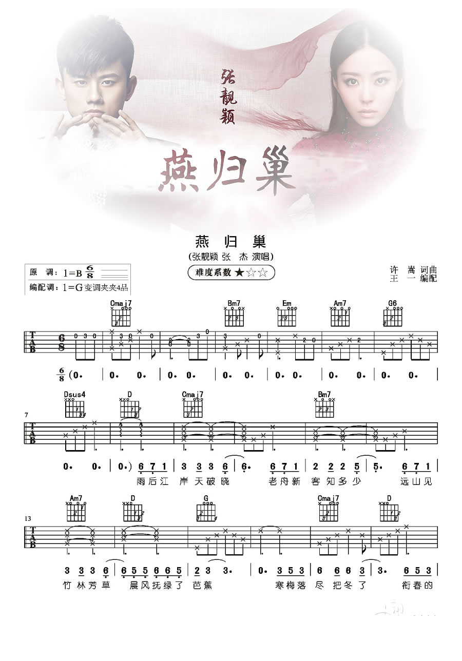 曲谱介绍: 张杰张靓颖演唱的燕归巢吉他谱,原调B,采用G调指法编配,变调夹夹第四品。燕归巢吉他六线谱,一首舒缓优美的中国风歌曲,获得最受欢迎男女对唱金曲奖,很有一种韵味,在年末春节听唱也很应景。希望你们回家路上,一路顺风。燕归巢吉他弹唱谱,许嵩词曲,三张图片谱例,随谱附上王一老师的吉他演奏示范,琴友们参照视频练习事半功倍。