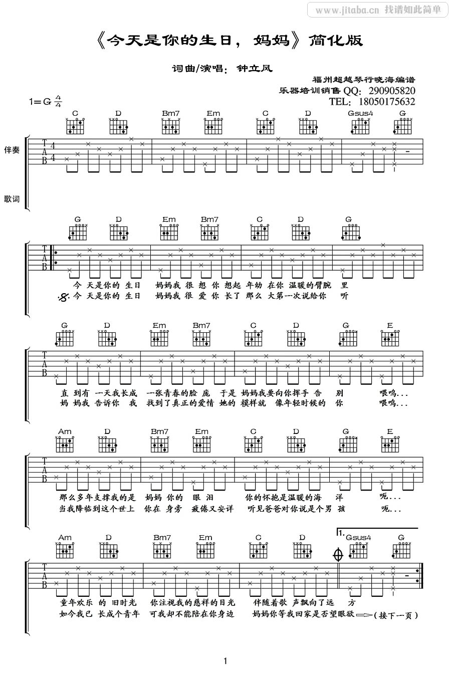 曲谱介绍: 今天是你的生日妈妈吉他谱,钟立风词曲原唱,曲谱为G调六线谱,简化版编配,感谢福州超越琴行晓海编谱分享。今天是你的生日妈妈吉他弹唱谱,和李健的温暖演绎不同,钟立风的版本是典型的民谣叙事的的方式,一字一句娓娓道来,满含深情。整首歌质朴中带着浓浓的生活气息。《今天是你的生日,妈妈》一首真挚的爱的表白,送给全天下的母亲。