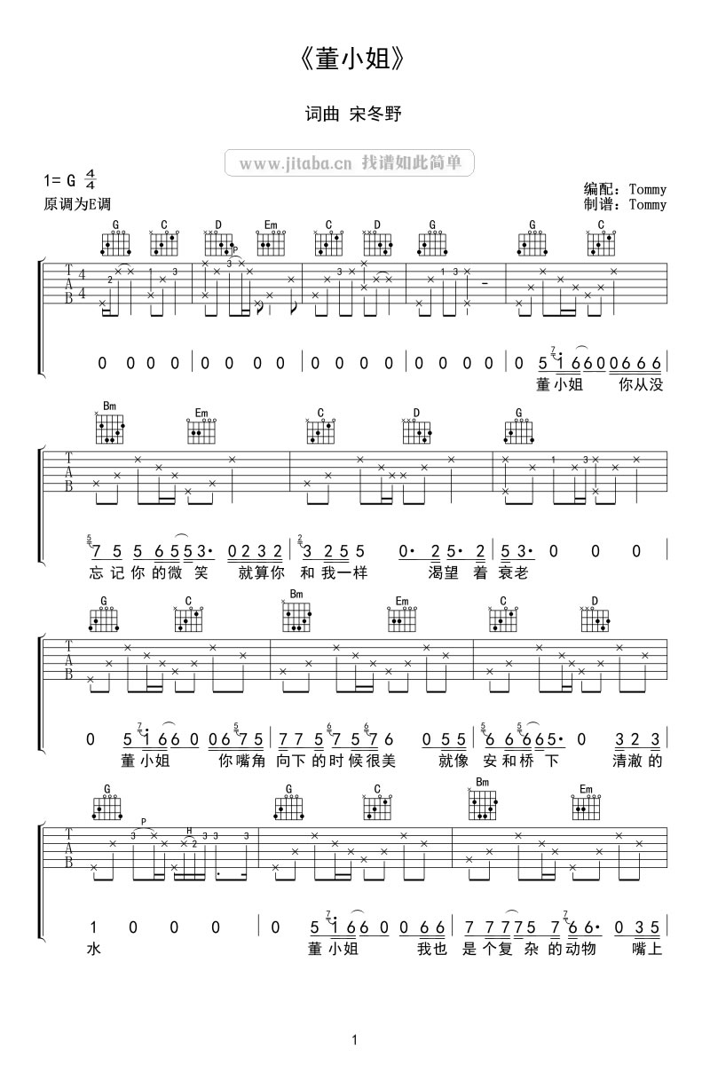 曲谱介绍: 宋冬野董小姐吉他谱简单版,右手扫弦版,原调E选用G调编配,董小姐吉他弹唱谱,四张图片谱分两页呈现,感谢Tommy编配制谱。歌曲唱出了男胖子们淡淡的忧伤,我想每个人的心里都有一个董小姐,就像每个人都有沈佳宜一样…我们的青春都会是我们记忆里最清晰的地方。可能若干年后,你已经忘记了她的容貌、她的体态…但是当时喜欢她的那种的感觉会时时的等着你唤起。
