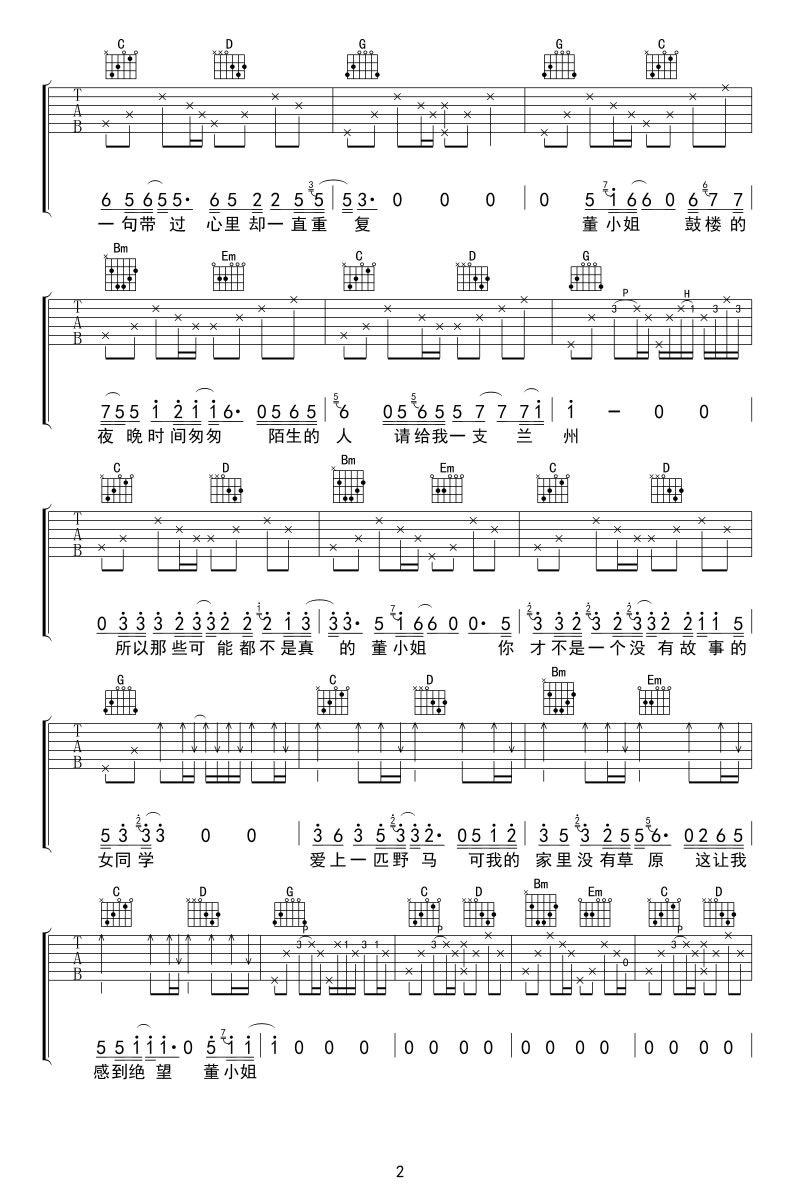董小姐吉他谱 - 宋冬野 - G调吉他弹唱谱