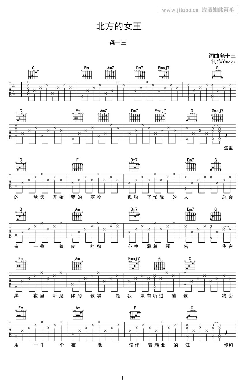 曲谱介绍: 尧十三北方的女王六线谱,C调编配,四张图片谱,北方的女王吉他谱,悠扬的口风琴,吹着动人的旋律,多情的木吉他,弹着歌者的悲伤。