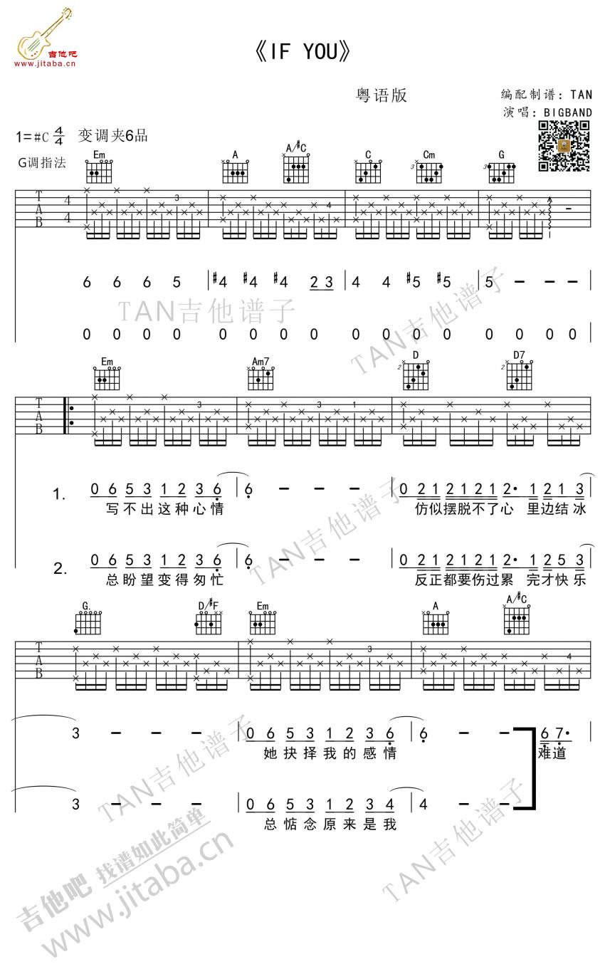 曲谱介绍: BigBang的if you吉他谱,郑子威翻唱粤语版歌词,if you吉他弹唱谱,六线谱图片格式,原调#C调,变调夹6品G调指法。感谢Tan编配制谱。