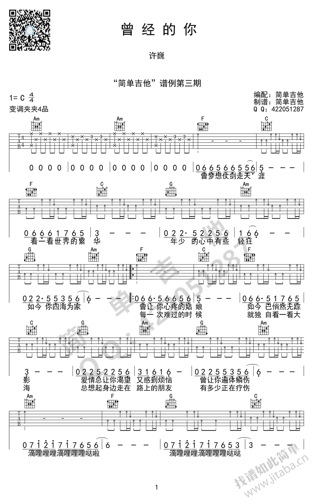 曲谱介绍: 许巍曾经的你吉他谱,C调编配,曾经的你六线谱,简单吉他谱例图片谱高清版。那个从古城西安走出来的背着吉他的少年,唱出了我们对现实的无奈、对爱情的渴望、对梦想的执着;如今的你已经云淡风轻,歌声里充满了对生命、对生活、对爱的感悟。我们都在经历着成长。曾经的你,此时此刻的你,还有未来的你,都会是怎样的模样?