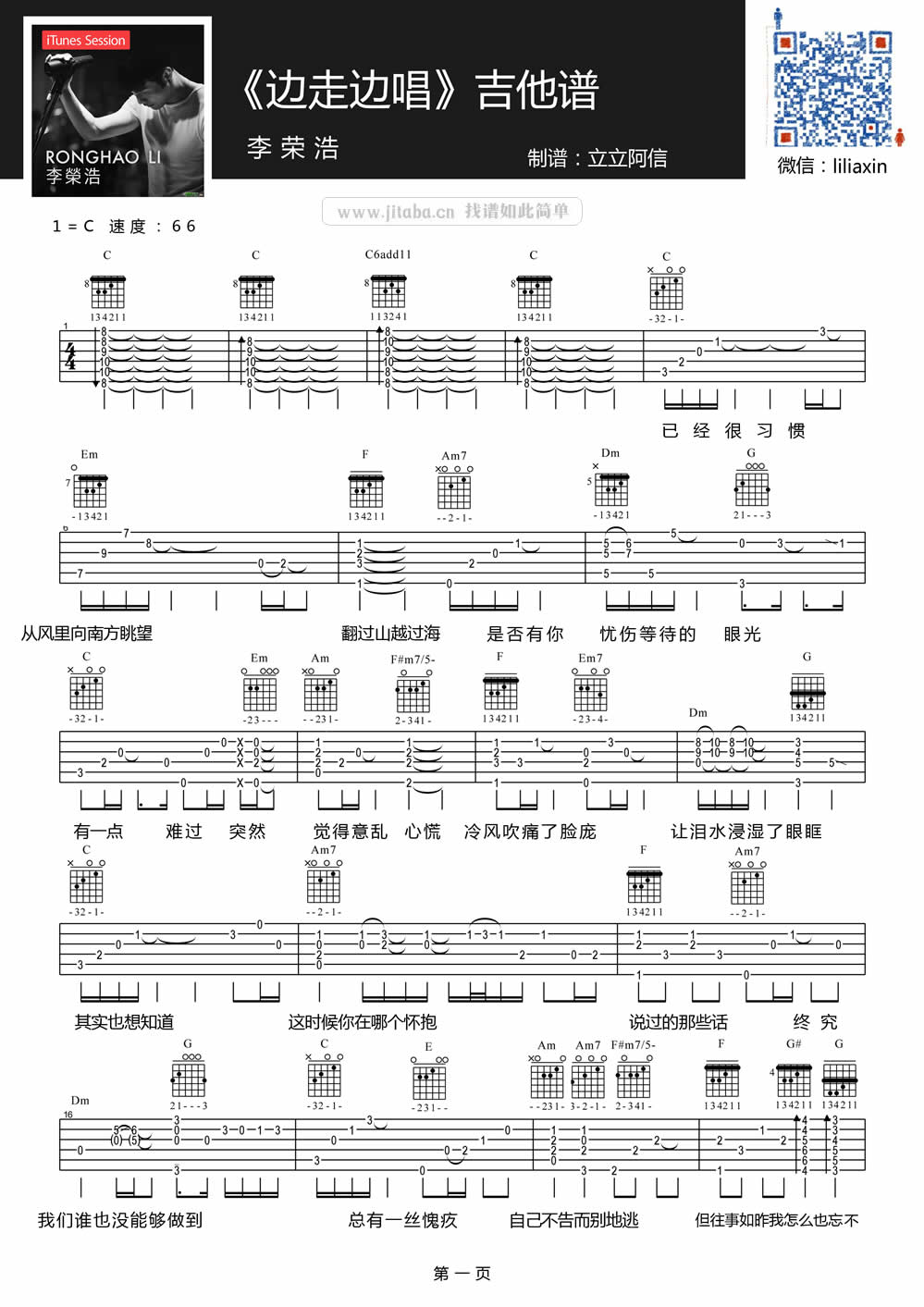曲谱介绍: 李荣浩边走边唱吉他谱,C调编配,六线谱编配,三张图片谱。李荣浩翻唱黄磊的《边走边唱》吉他弹唱谱,声音与歌曲的契合度高,传统华语芭乐情歌曲调上口,主旋律还蛮不错的。边走边唱,唱不出地久天长,却唱出了每个人爱的心伤和迷茫。感谢立立阿信制谱分享,李荣浩歌曲吉他谱大全收藏。