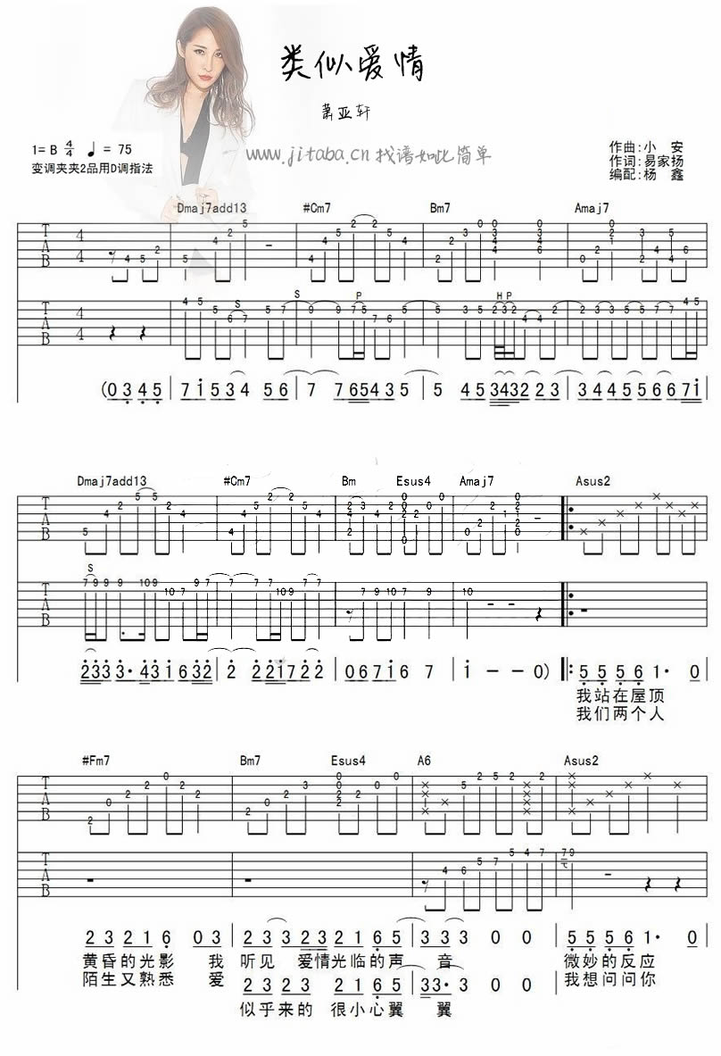 曲谱介绍: 萧亚轩类似爱情吉他谱,原调B,变调夹夹第二品用D调指法,类似爱情吉他弹唱谱,六线谱图片完整版。歌曲唱出了多少人刻骨铭心的爱。而歌所要表达的,无非就是那些“类似爱情”的东西,两男一女的爱,男男之间的恋,那些令人些许痛楚和感伤却只能是“类似”的爱情。浅唱低吟,自言自语,有种淡淡的忧伤的感觉。萧亚轩吉他谱整理收藏。