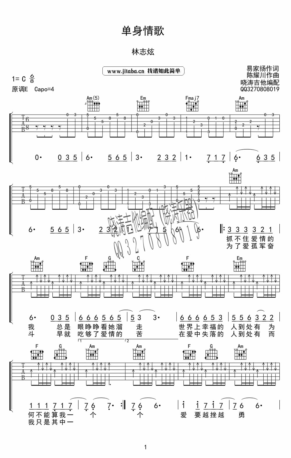 曲谱介绍: 林志炫单身情歌吉他谱,原调E变调夹夹4品选用C调指法。光棍之歌的经典代表,一首《单身情歌》唱出了多少单身狗的心声,单身情歌吉他弹唱谱,六线谱编配高清图片版本,感谢晓涛吉他编配。历久弥新的歌曲唱出孤单男女期盼渴望一份真爱却不可得的心情,治愈抚慰无数单身族的心灵。