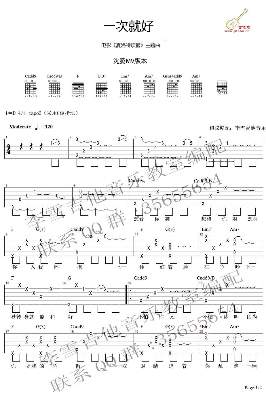 曲谱介绍: 沈腾一次就好吉他谱,电影《夏洛特烦恼》主题曲,一次就好吉他弹唱谱,六线谱编配,变调夹夹第二品,采用C调指法,图片谱根据沈腾MV版本改编。这首歌有好几个版本,杨宗纬,马丽,终究还是最喜欢沈腾的,虽不专业,却总觉最动情。愿你,和你的爱人,如你歌词里写的一样,“一次就好,想带你去看天荒地老。”送上这首适合在安静的夜里轻轻弹唱的歌曲,一次就好吉他六线谱。