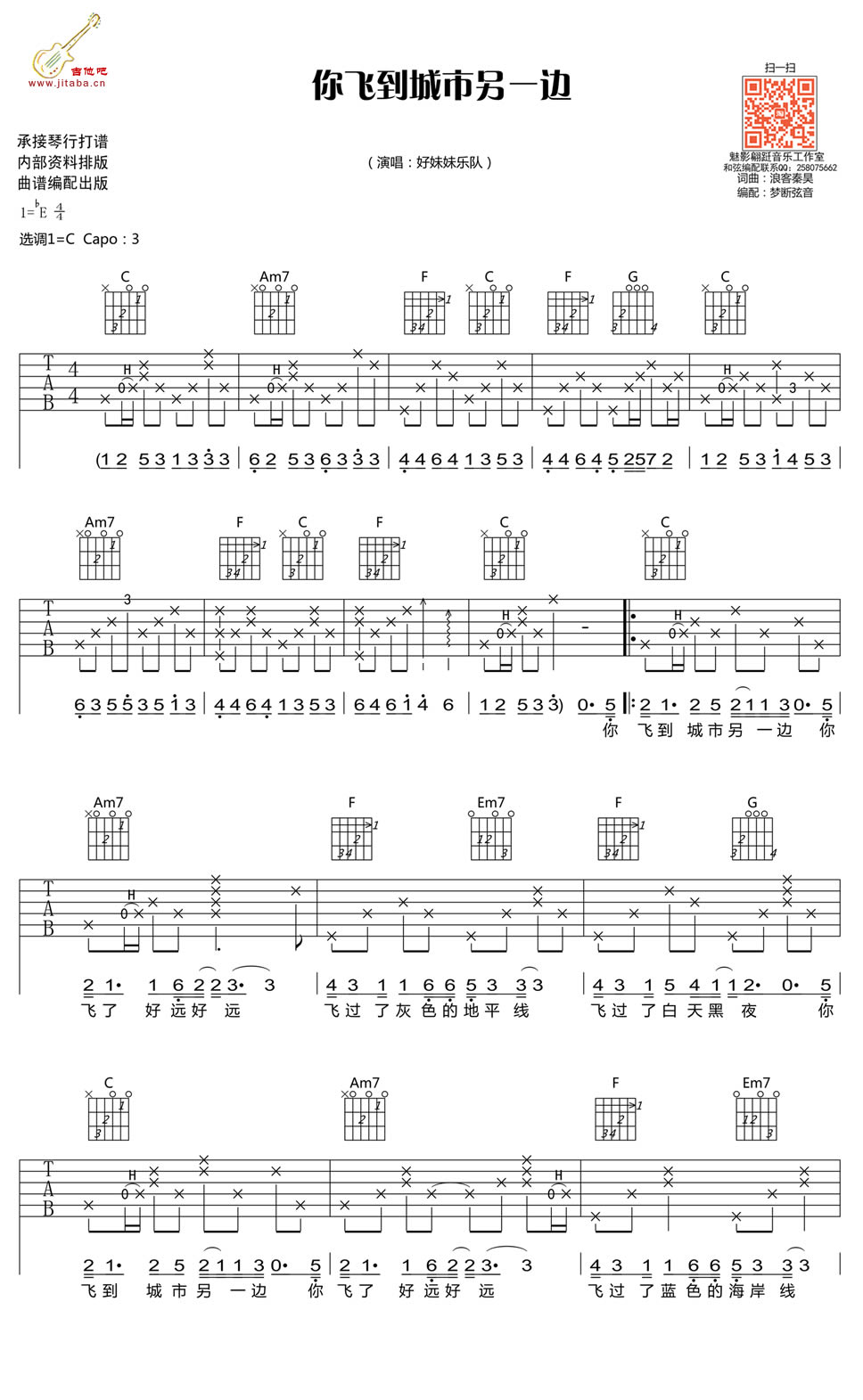曲谱介绍: 你飞到城市另一边吉他谱,好妹妹乐队的吉他弹唱民谣歌曲,曲谱为六线谱高清图片谱格式,你飞到城市另一边吉他弹唱谱,原调降E,变调夹夹三品,选调C调指法。特别喜欢民谣歌手用一种婉转的调子唱出“少年~”,唇间齿间一流转,感觉那些美好灵性不羁浪漫的东西都肆意抖了出来……感谢魅影翩跹音乐工作室供谱分享。