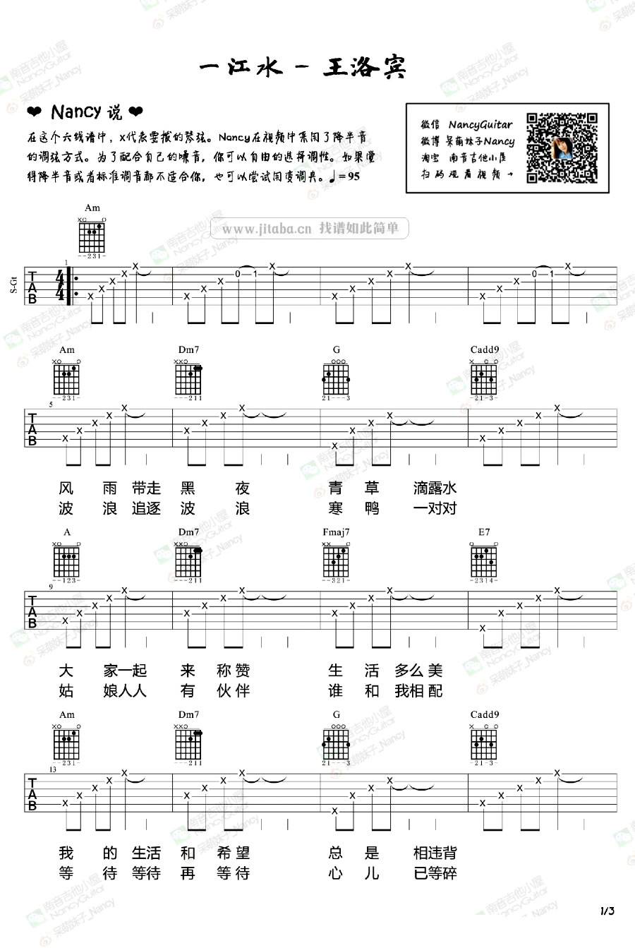 曲谱介绍: 许巍一江水吉他谱,在这《一江水》六线谱中,X代表要拨的琴弦,琴友们可以根据自己的嗓音自由选择调性,如果降半音或标准调弦都不适合自己,也可以尝试使用变调夹。一江水吉他弹唱谱,共三张图片谱子,感谢南音吉他小屋供谱分享。喜欢王洛宾老先生改编的这首民谣歌曲的朋友们,一起通过下面Nancy老师的《一江水》吉他弹唱教学视频来学习吧。