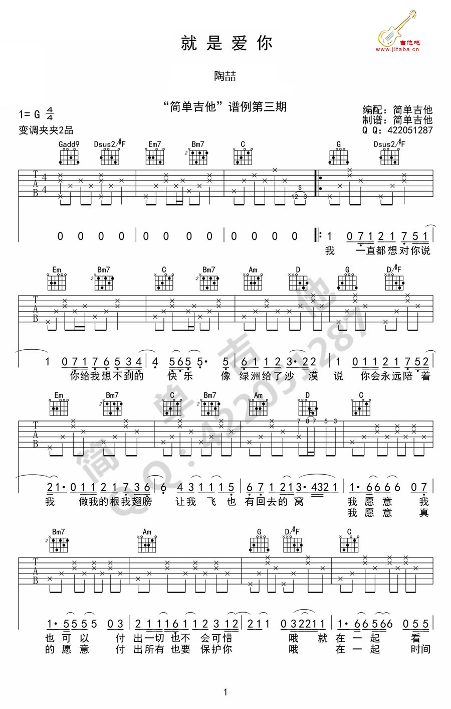 曲谱介绍: 陶喆就是爱你吉他谱,G调六线谱编配,变调夹夹第二品。就是爱你吉他弹唱谱,高清图片谱,简单吉他编配制谱。陶喆一首独特的R&B风格的歌曲,轻快抒情,唱出了很多人年轻的心声,就是爱你,不离不弃。爱上一个人可能只需要一秒种,而你却要付出所有感情,尽管结果并不总如人意,但却无怨无悔。