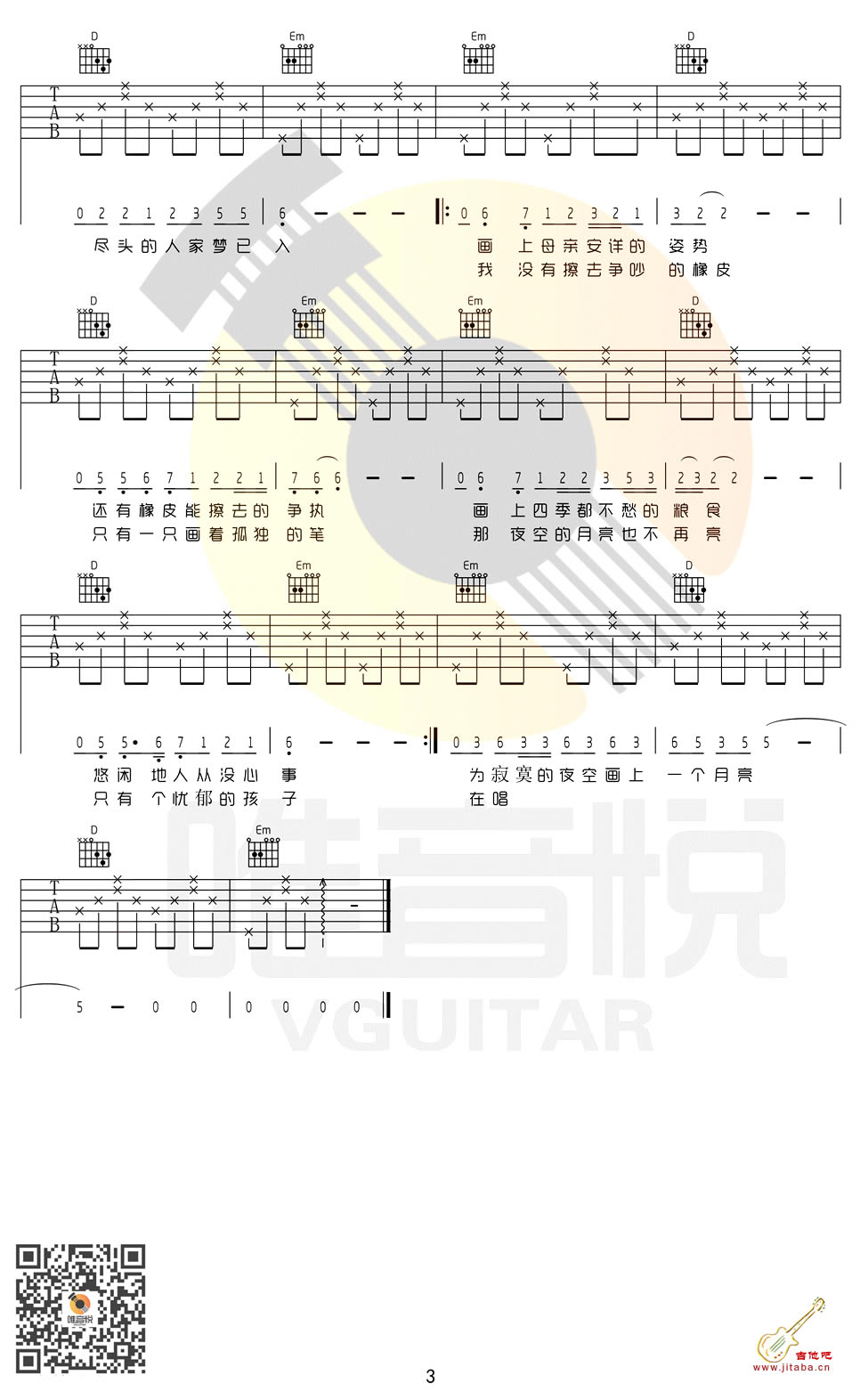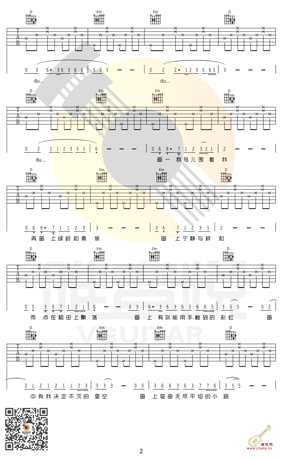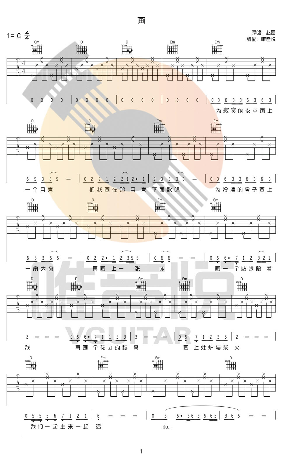 曲谱介绍: 赵雷画吉他谱,C调指法编配,超级简单版,分解和弦六线谱,画吉他弹唱谱,共三张高清图片谱。赵雷的《画》非常好听,很有画面感的民谣风歌曲,唯美文艺,那轻快而又伤感的音质令人陶醉。