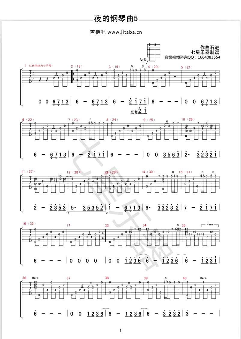 夜的钢琴曲五吉他谱 - 吉他独奏谱