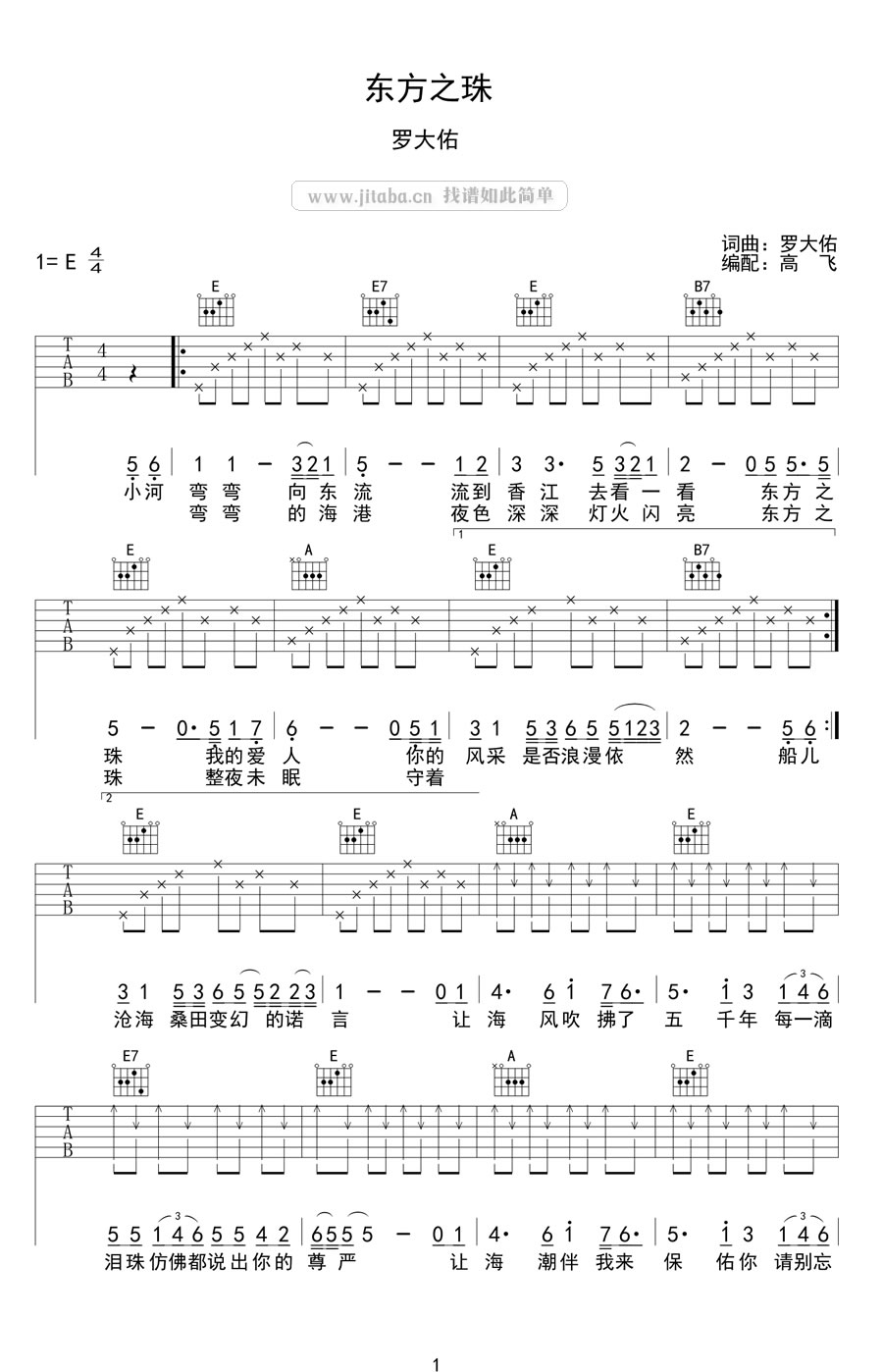 曲谱介绍: 罗大佑东方之珠吉他谱,E调指法,东方之珠吉他弹唱谱,六线谱编配。罗大佑的经典歌曲,唱红了香江、珠江、长江和黄河,也唱遍了海外华人社区。情深意切的歌词,唱出了历史唱出了期盼,温柔委婉动人。每当《东方之珠》的旋律在耳边响起,总会让人联想到灿若星河、美不胜收的维多利亚港。