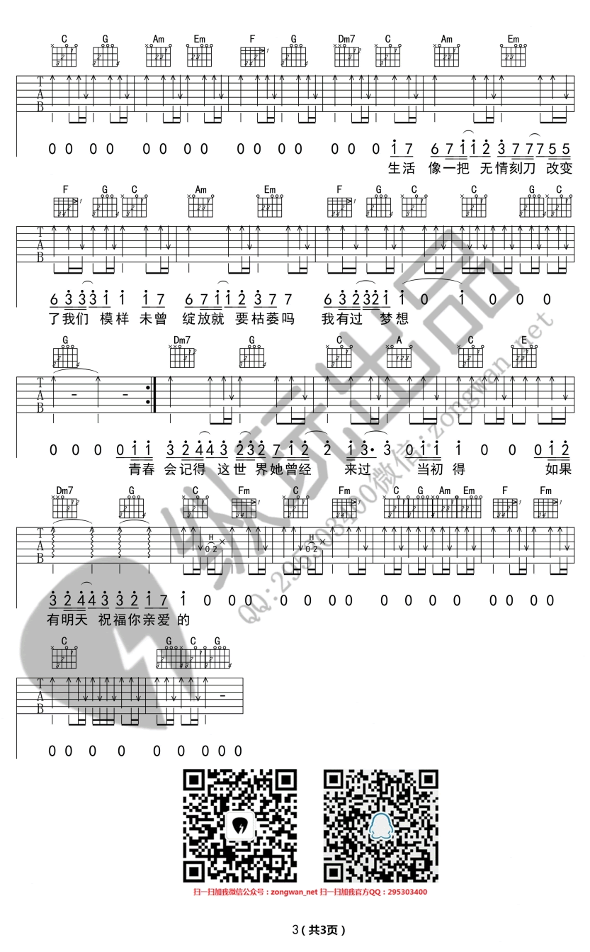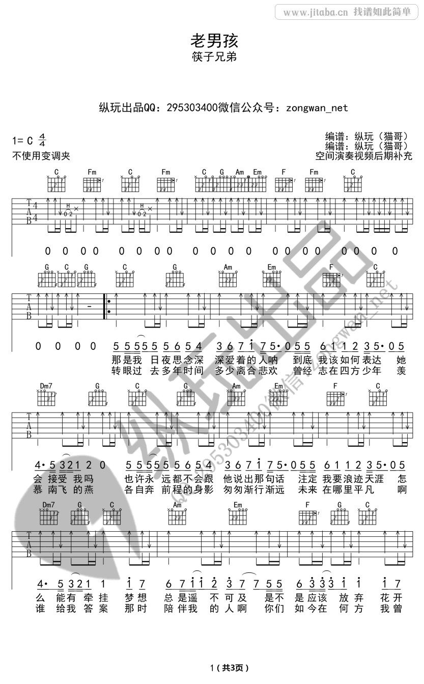 曲谱介绍: 筷子兄弟老男孩吉他谱,C调指法,不使用变调夹,图片谱高清版,老男孩吉他弹唱谱,六线谱编配,感谢纵玩猫哥编谱。随谱送上《老男孩》吉他弹唱教学,方便大家学习。