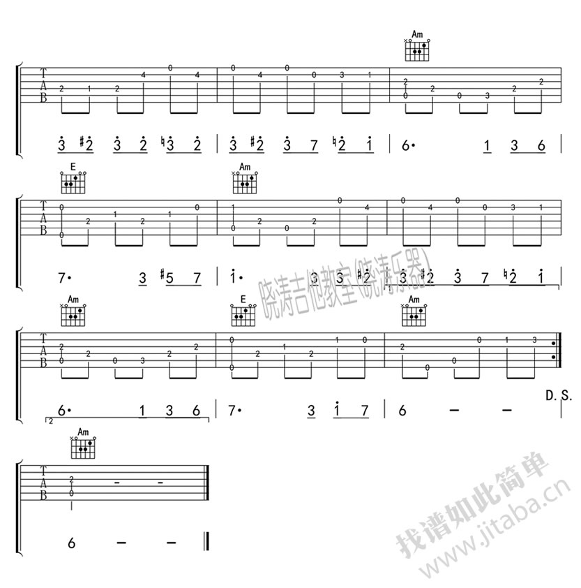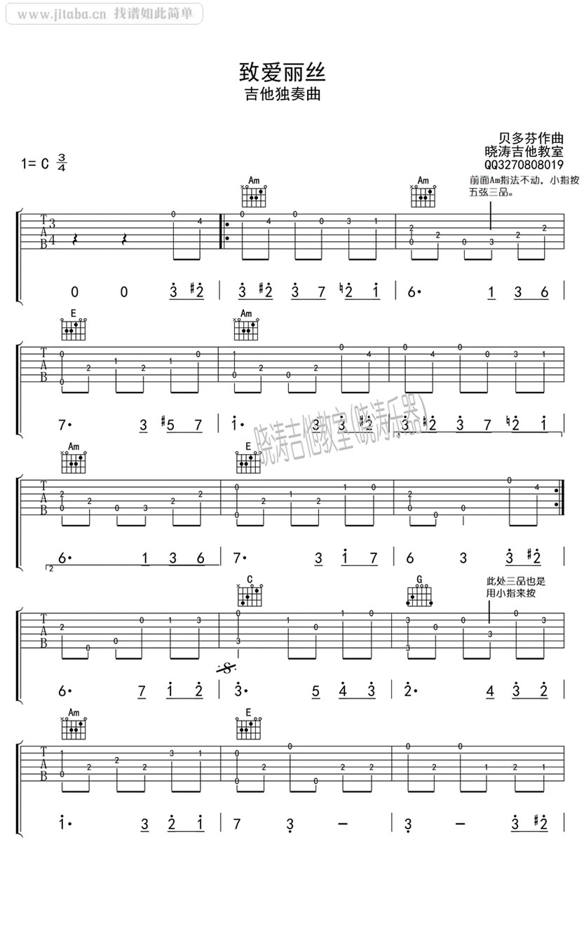 曲谱介绍: 致爱丽丝独奏曲吉他谱,贝多芬名曲致爱丽丝吉他曲独奏谱,C调六线谱编配,前面Am指法不动,小指按五弦三品,曲谱共两张图片谱例,一曲爱意浓浓的旋律,优美的音符流淌在指间,感觉是那么美好,感谢晓涛吉他教室分享。