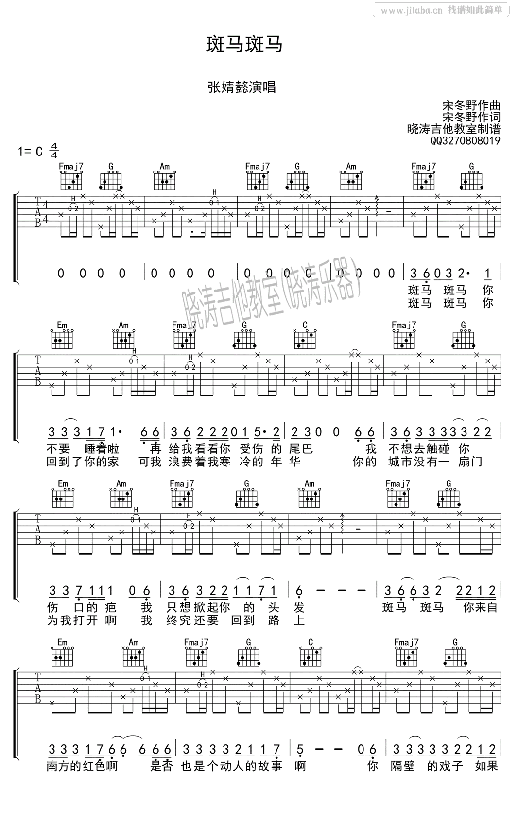 斑马斑马吉他谱 - 宋冬野(张婧懿) - C调吉他弹唱谱