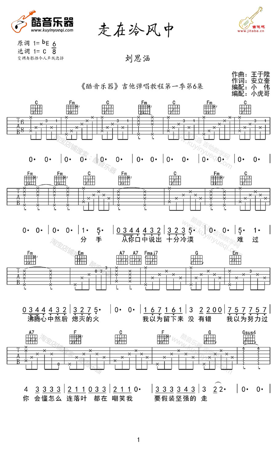 曲谱介绍: 走在冷风中吉他谱,刘思涵演唱,歌曲原调降E调,选用C调指法,Capo根据琴友们个人声线选择。走在冷风中吉他弹唱谱,六线谱编配高清版,分三张图片谱。曲谱为酷音乐器吉他弹唱教程,感谢小伟小虎哥编配制谱。让人反复循环聆听的好歌曲,温暖的声线,感染力十足的歌声,能让整个世界静止下来。
