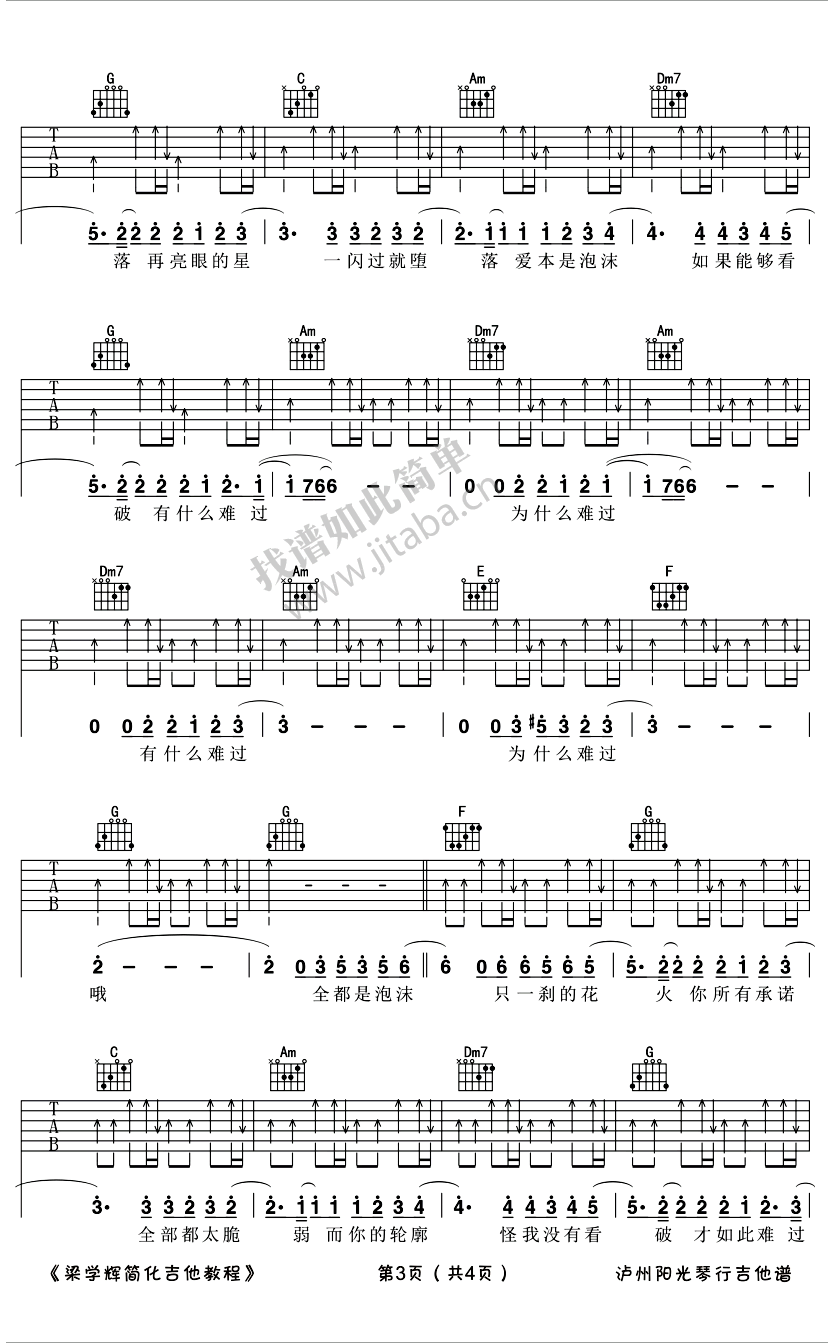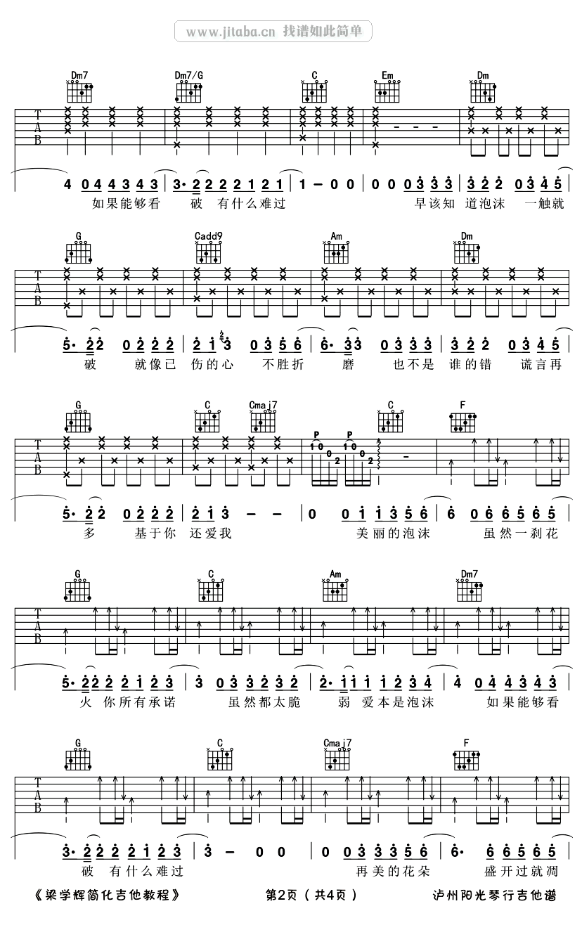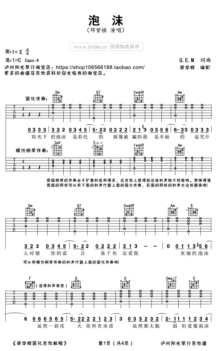 曲谱介绍: 邓紫棋泡沫吉他谱,六线谱编配,原调E选用C调指法,变调夹Caop四品。降低和弦指法难度的编配,有利于吉他初学者弹奏,琴友们可以根据自己音域选择变调夹的品格。另外模仿钢琴和弦音的和弦,指法跨度较大,比较难按,同学可以多多练习。GEM鄧紫棋的经典代表歌曲《泡沫》吉他弹唱谱,四张图片谱。泡沫这首歌曲用感性的声线,细腻唱出我们每个人心中隐藏最深的情绪,那些爱情已成往事的无奈与辛酸。感谢梁学辉编配分享,如果琴友们需要《吉他初级深入教程》可以与之联系购买。邓紫棋热门歌曲吉他谱收藏,只在91吉他谱网站。
