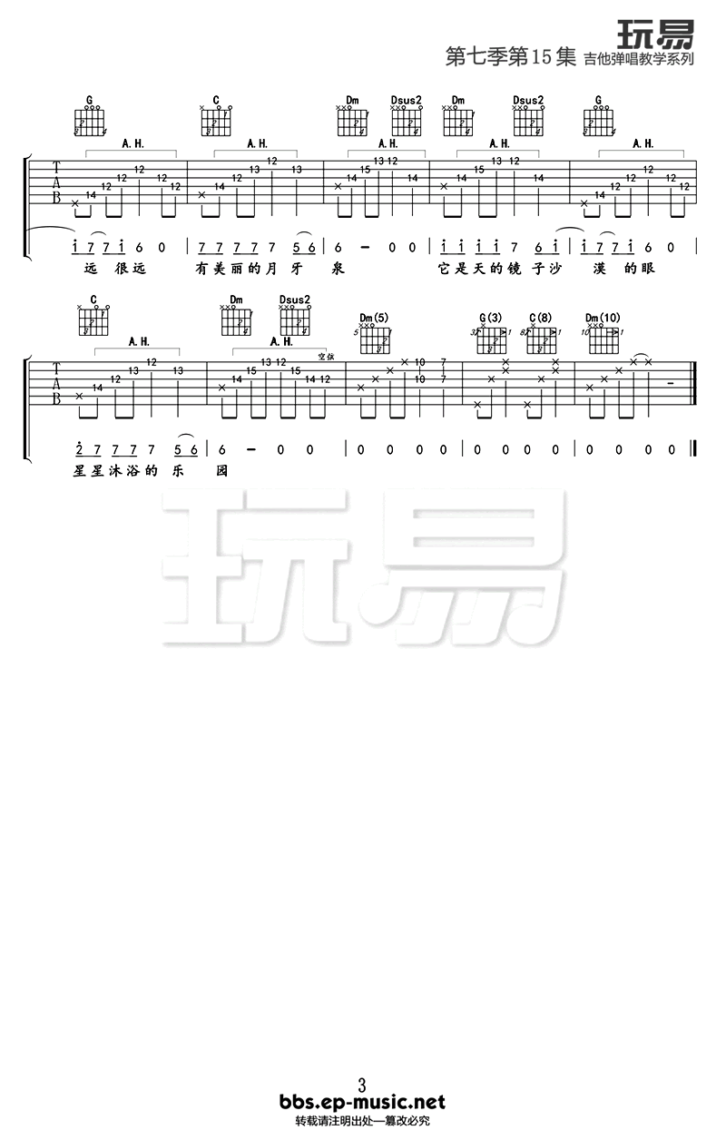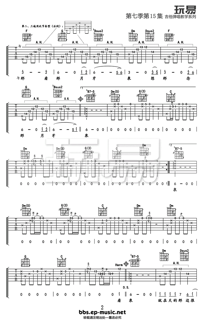 曲谱介绍: 田震的《月牙泉》吉他谱,高清图片谱,月牙泉吉他六线谱,共三张谱例,前奏很简单,就用到了一个和弦,不过注意使用人工泛音技巧。这首田震的经典老歌,简单却不失优美,旋律中透着的沉静优雅,有着一份月牙泉水的清澈清凉,歌词里让人有无限幻想。随曲谱附上月牙泉吉他弹唱教学视频,感谢编配老师王飞老师和Amylee演绎示范详解。