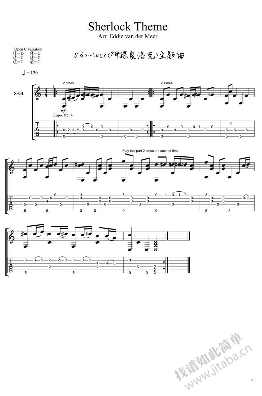 曲谱介绍: Sherlock主题曲吉他谱指弹版,BBC电视剧《神探夏洛克》主题曲, Sherlock的配乐,是剧中一大亮点。强弱分明,极强节奏感,配合极美的画面、精巧的情节,撩人心弦。sherlock神探夏洛克吉他独奏曲图片谱。
