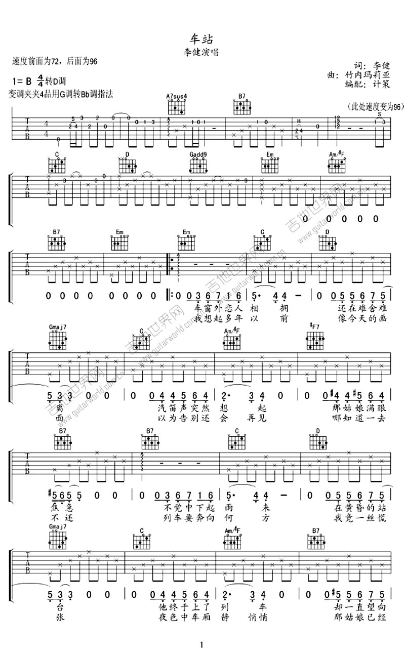 曲谱介绍: 李健车站吉他谱,车站六线谱编配,三张图片谱。原调B 转D,变调夹夹四品,采用G调转降B调指法,速度前面为72后面为96。李健在《我是歌手》节目演绎的一首根据日文歌曲改编的《车站》,唱出一种怀旧与沧桑,歌词唱出画的感觉,音乐又是那么自然的进了心里,整体心纠纠的难过着,好似真的黄昏时分你站在夕阳里与谁在车站惜别。李健车站吉他弹唱谱,感谢计策编配,需要打印学习的琴友们可以联系编配者购买高清版,以支持曲谱原创作者。
