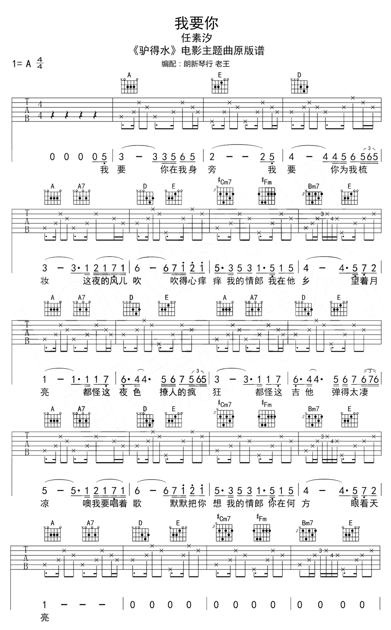 曲谱介绍: 我要你六线谱,任素汐演唱,电影《驴得水》主题曲,吉他弹唱原版谱,我要你吉他谱,A调指法,图片谱高清版。这个旋律每一次响起,好像还是刚看完《驴得水》的曼妙,满脑子都是张一曼坐在屋顶晃着腿唱这首歌的样子。初冬的风童话一样温柔,一步一步踩在城市的树梢上,抬头是心心念念的天空。推荐电影《驴得水》中任素汐唱的《我要你》。