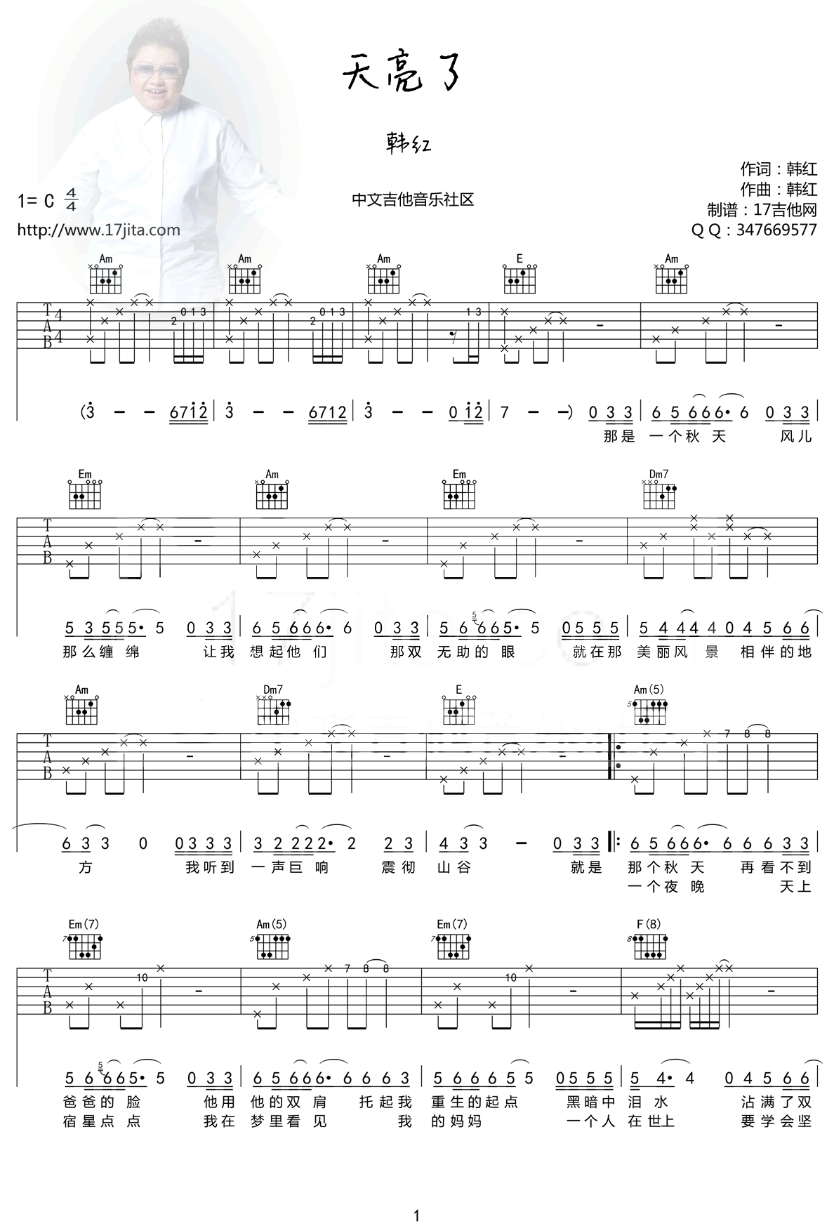 天亮了吉他谱 - 韩红 - C调吉他弹唱谱