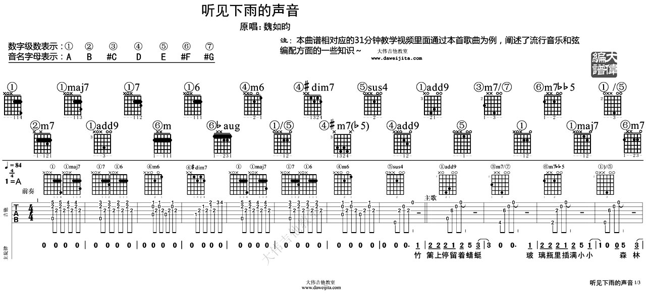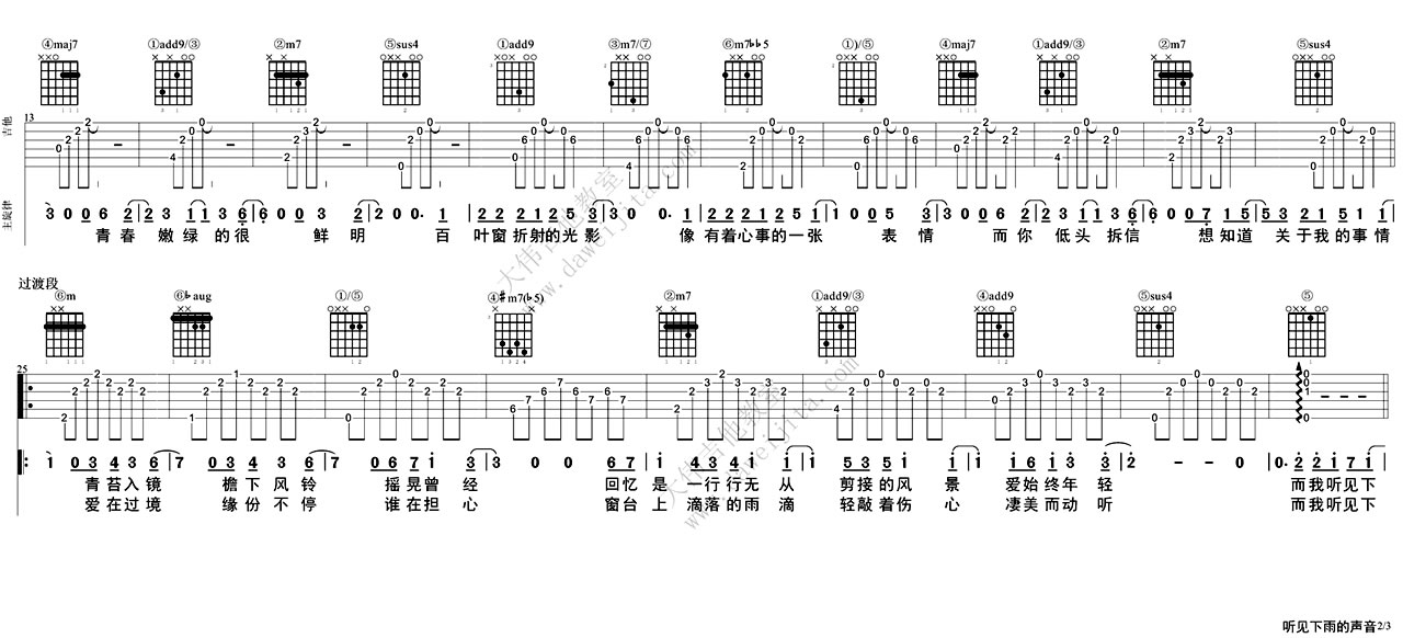 曲谱介绍: 听见下雨的声音吉他谱,六线谱高清版,中国好声音关诗敏女生版本,歌曲原唱魏如昀唱出了恋爱的惆怅,周杰伦的男生版唱出了回忆的心酸,A-Lin则唱出了无限的伤痛,听见下雨的声音吉他弹唱谱,感谢大伟教室为琴友们准备了周杰伦方文山这首经典音乐作品,编配完美原版呈现。听见下雨的声音图片谱可以另存为电脑放大至原图查看。