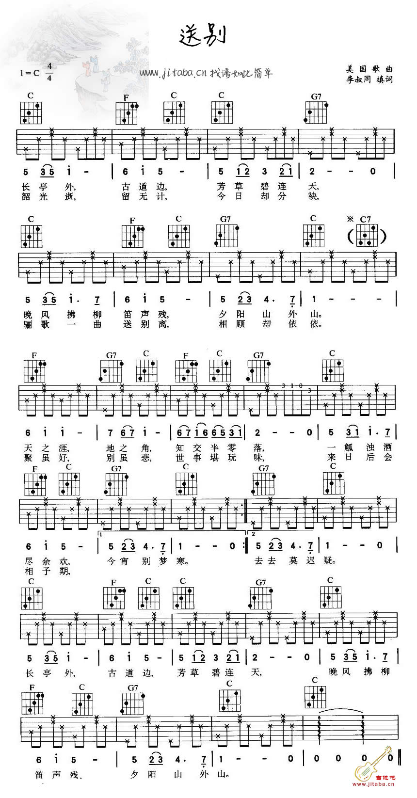 曲谱介绍: 送别吉他谱C调简单版,图片格式六线谱编配,李叔同填词的一首广为流传的歌曲,意蕴悠长的旋律唱出了离愁别绪,满满的不舍和思恋、深深地情谊和珍重。送别吉他弹唱谱。曲谱弹奏非常简单,是非常适合吉他新手的练习曲目。