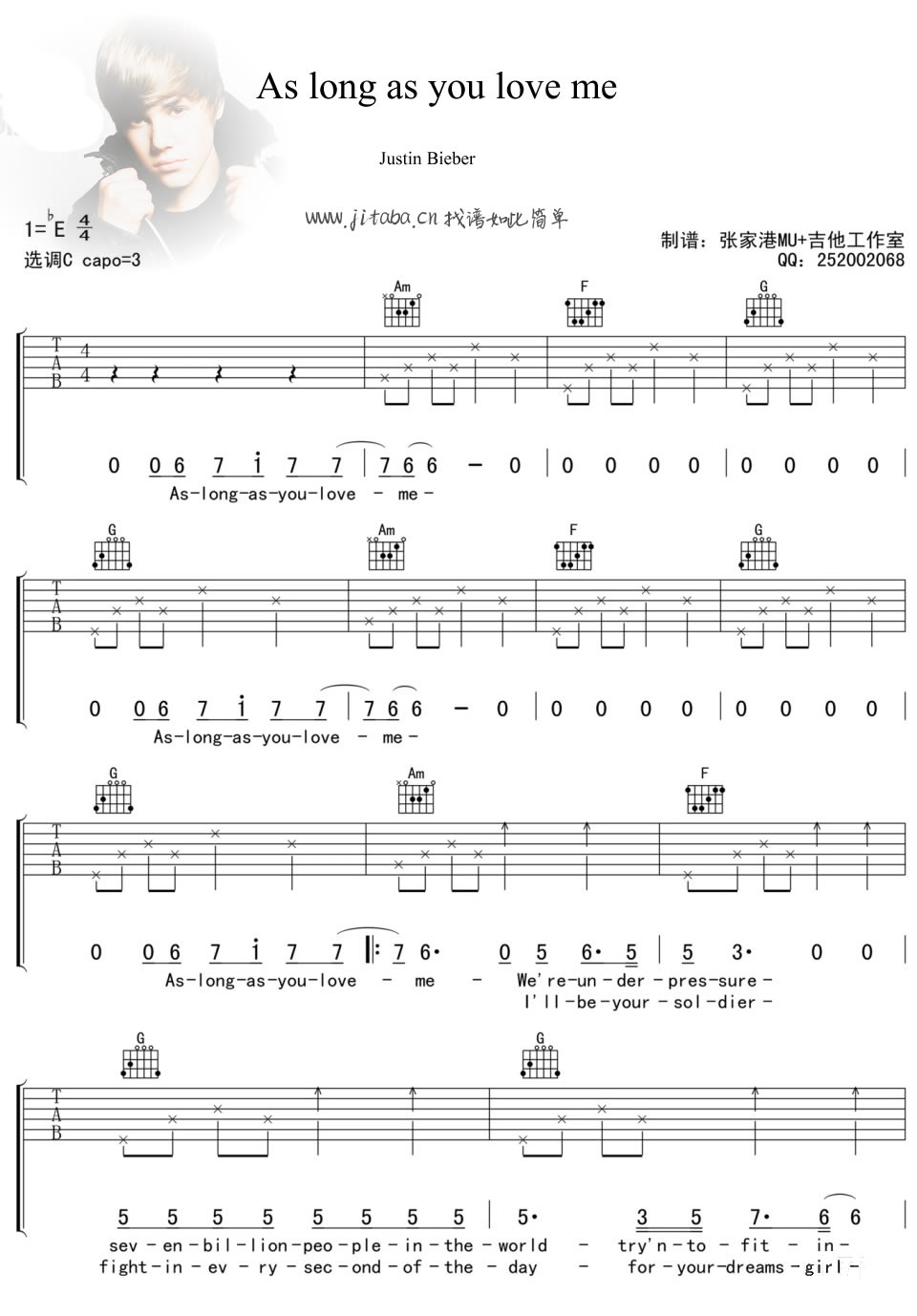 曲谱介绍: Justin Bieber As long as you love me吉他谱,原调bE,选调C,变调夹夹第3品,As long as you love me吉他弹唱六线谱,四张图片谱子。很喜欢Justin Bieber,从One time就渐渐开始关注,As long as you love me开始见证着他的成长,如今,青涩的嗓音变得稍显成熟,却依旧动听,令人着迷。真挚的歌声,悦耳的旋律,伴随着吉他琴音,静静弹唱,别有一番韵味。