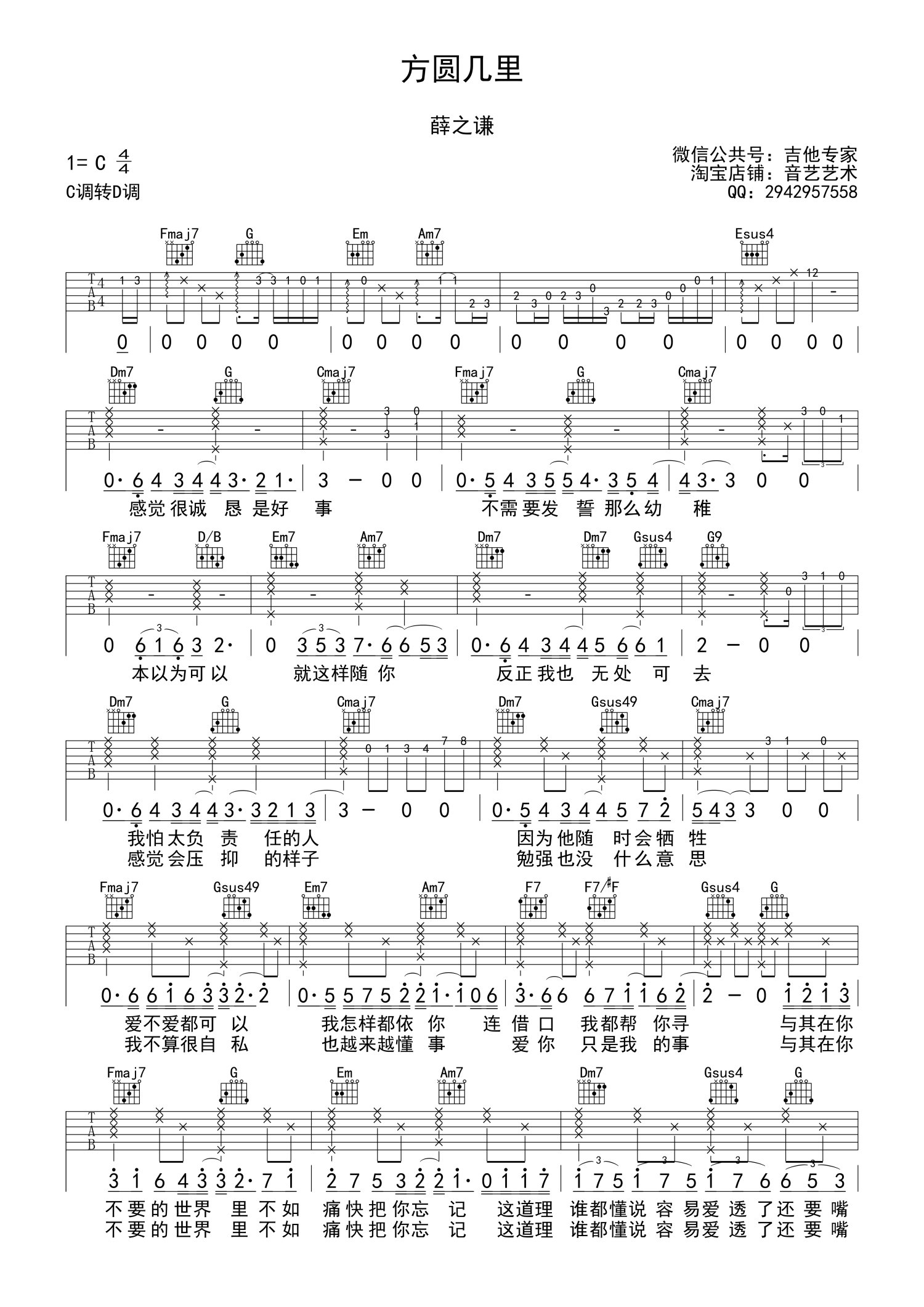 • 方圆几里吉他谱 - 薛之谦 - C调吉他弹唱谱第1张