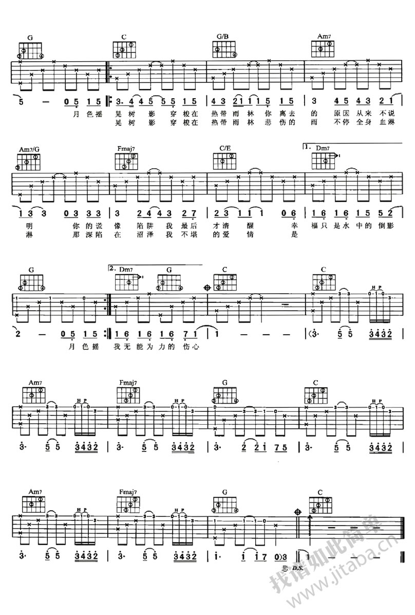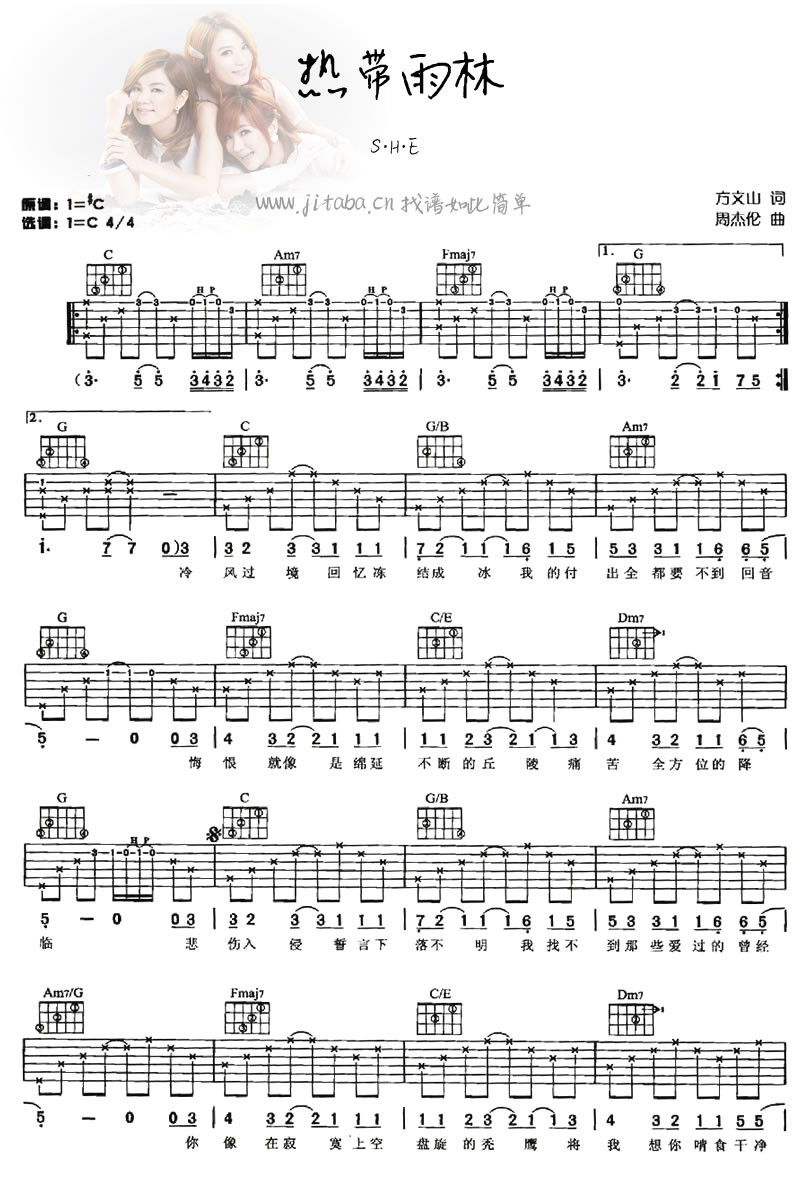 曲谱介绍: S.H.E热带雨林六线谱,原调#C选调C调指法。热带雨林吉他谱,图片谱编配格式。网上无意看了SHE演唱会上重唱这首《热带雨林》,月色摇晃树影,穿梭在热带雨林。悦耳的歌声,动听的旋律,整理这首歌的弹唱谱给大家,喜欢的琴友不妨练习看看,周杰伦和方文山合作的一首很好听的音乐作品。