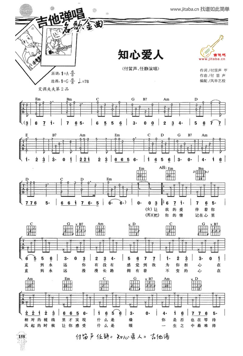 曲谱介绍: 任静付笛生的知心爱人吉他谱,知心爱人吉他弹唱谱,一首经典的男女生对唱情歌,前奏是由歌曲A段旋律改编而成,指弹或者拨片弹奏均可。喜欢这样的旋律,也喜欢这样的歌, 唱出了爱情的蜜意浓情,也让人憧憬一些温馨暖人的画面。人世间最大的幸福莫过于拥有一个幸福的家,拥有一个爱我所爱的人,拥有一生最幸福的生活。感谢风华艺校编配。