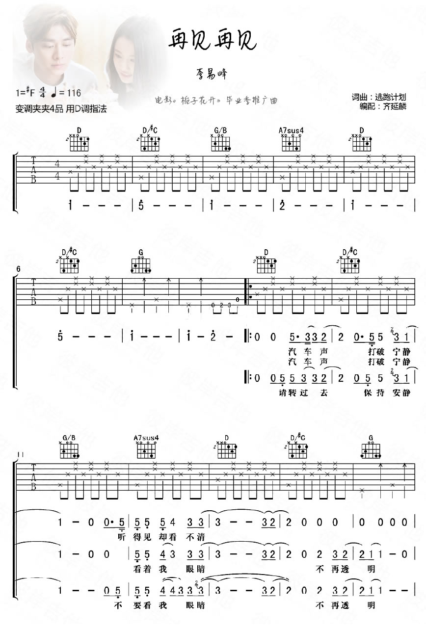 曲谱介绍: 李易峰再见再见吉他谱,六线谱编配,高清版图片谱共三张。再见再见吉他弹唱谱,原唱是逃跑计划,李易峰为电影《栀子花开》演唱的推广曲,用细腻声音唱出了最纯真的青春和少年离别时的苦闷揉进潇洒;感谢齐延麟编配分享,歌曲原调#F,变调夹夹第四品选用D调指法。