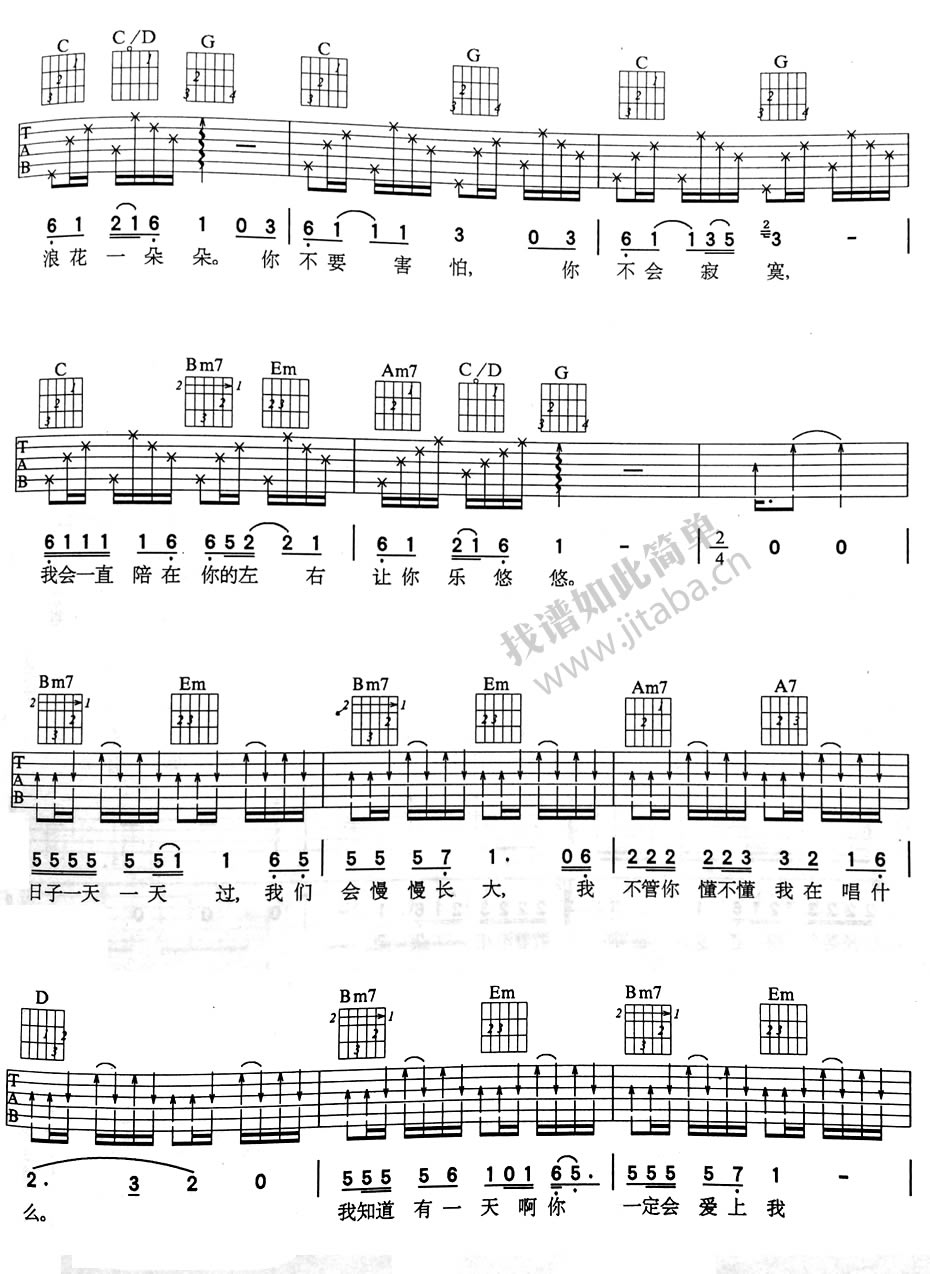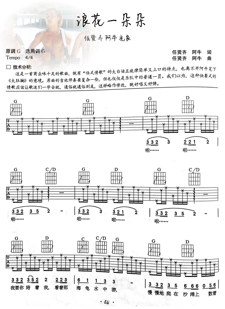 曲谱介绍: 浪花一朵朵吉他谱,原调G,任贤齐、阿牛、光良演唱,浪花一朵朵吉他弹唱谱,六线谱图片三张。这首歌曲商业味十足,有着任式情歌的大白话且旋律简单又上口的特点,也离不开阿牛笔下《大肚腩》的意境。原曲的吉他伴奏要复杂一些,但也仅仅是乐队组成中普通的一员。这种快餐式的情歌歌迷们应该一学就会,通俗就通俗到底,这样略作修改,既好唱又好弹。