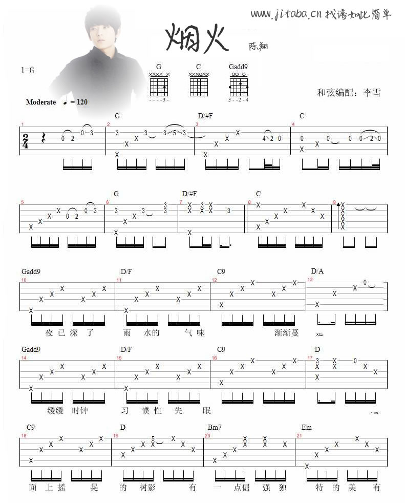 曲谱介绍: 陈翔烟火吉他谱,G调指法编配,烟火图片谱三张谱例。每首歌都有独特的韵律,每个人都有逝去的流年。而你的歌却唱进了不少人的内心深处,唱出了不少人的无声流年。岁月如歌,在这美好的似水年华与你的歌邂逅,犹如那轻划过天际的烟火那般绚烂。