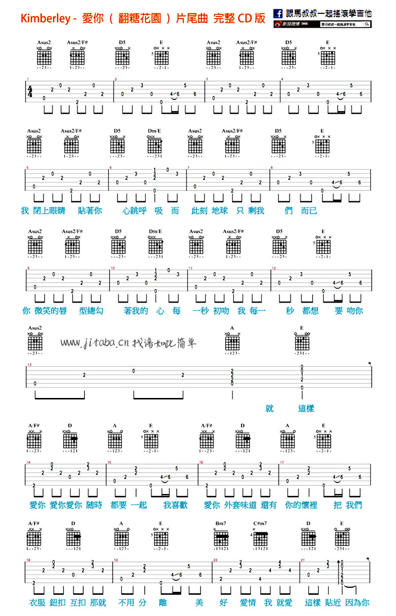 曲谱介绍: 陈芳语爱你吉他谱,Kimberley演唱的爱你吉他弹唱谱,翻糖花园片尾曲。陈芳语稚嫩中略带一丝可爱的声音,唱出我们校园时代无所畏惧的爱情,就这样爱你爱你爱你随时都要一起。